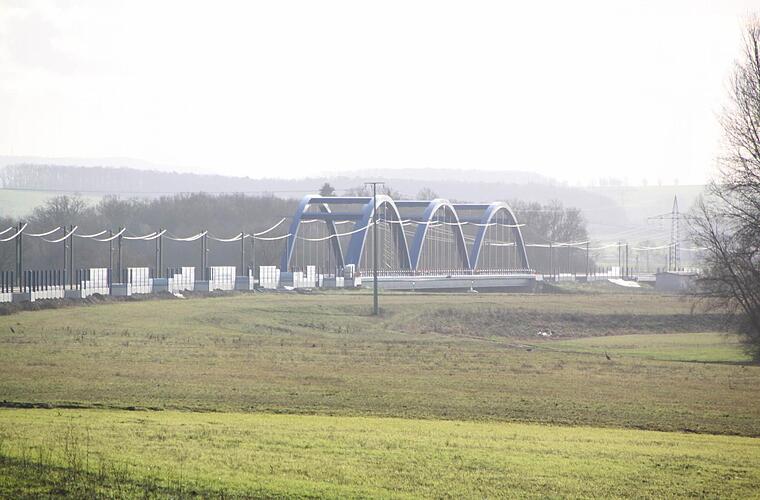 Im September sollen schon die ersten Züge auf der Neubaustrecke zwischen Wiesen und dem Eierberg-Tunnel fahren. Im Bereich rund um Wiesen werden momentan die Schallschutzwände gesetzt. "Für die blauen Bogenbrücken hat ein Gestaltungsbüro extra transparente Schallschutzwände angedacht",sagt Frank Kniestedt, Pressesprecher des Verkehrsprojektes Deutsche Einheit Nr. 8, kurz VDE 8. Von Ebensfeld bis Breitengüßbach ist es eine einzige riesige Baustelle, fährt er fort. 400 bis 500 Leute arbeiten auf insgesamt rund 22 Kilometern Strecke. "Das ist die größte Bahnbaustelle Bayerns, wenn nicht sogar Deutschlands." Auf der gesamten Strecke werden alle Haltepunkte neu gebaut, immer im gleichen Schema: In der Mitte ist der Bahnsteig und links und rechts daneben die Gleise. "Dafür müssen dann natürlich Unterführungen, Rampen und Aufzüge gebaut werden, damit die Leute auf den Bahnsteig kommen", erläutert Kniestedt.