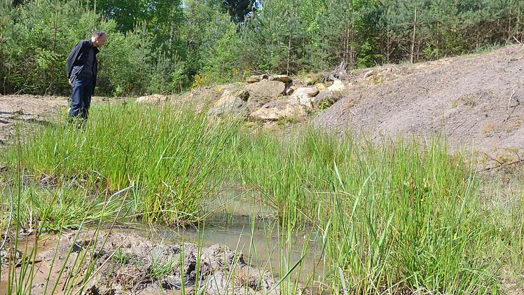 Blanker Boden, Steine und ein wenig Grün an einem kleinen Tümpel. Karg wirkt die frühere Tongrube im Waldstück Mönchsholz bei Sonnefeld. Genau das soll sie auch. Forst, behördlicher Naturschutz und Landesbund für Vogelschutz (LBV) haben hier gemeinsam dafür gesorgt, dass etwas entstanden ist, was die Fachleute einen Primärstandort nennen.