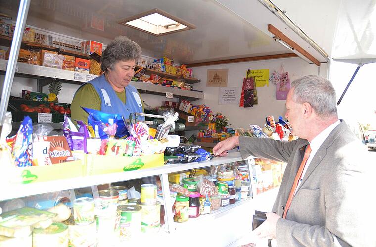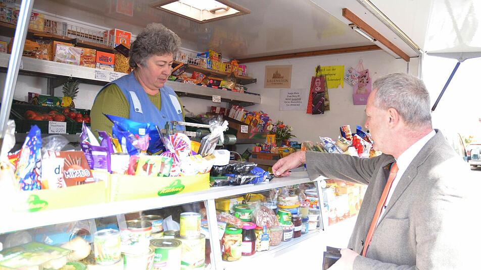 Es ist kurz vor 10 Uhr, als der weiße Kleinbus mit dem Verkaufsanhänger in der Allee in Fürth am Berg hält. Er wird jeden Donnerstag schon erwartet, denn es ist ein fahrender Tante-Emma-Laden, mit dem Sonja Horn unterwegs ist. An diesem "Gründonnerstag" warten nicht nur die üblichen Kunden. Auch Neustadts Oberbürgermeister Frank Rebhan (SPD) steht heute an der Haltestelle. Er hat noch jemanden mitgebracht. Der Landtagsabgeordnete Klaus Adelt, möchte den rollenden Laden von Sonja Horn kennen lernen.