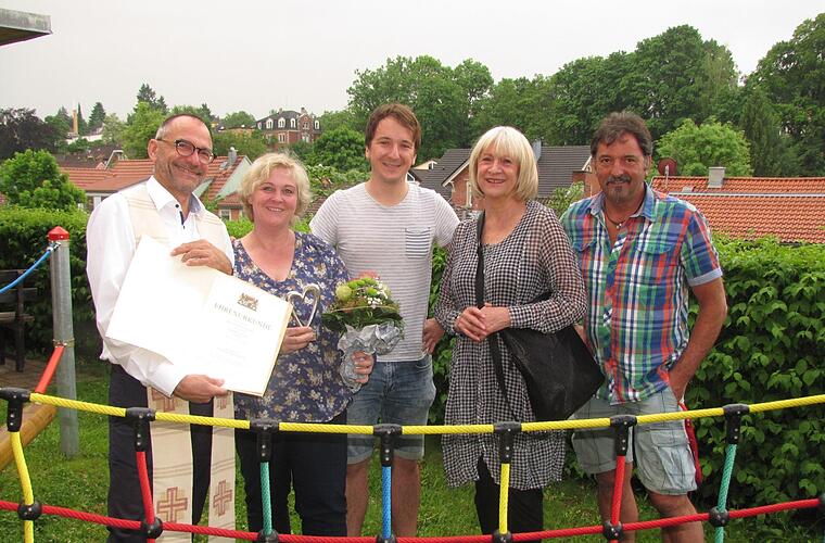 Etwa 100.000 Euro habe das ganze Projekt gekostet, sagte Florian Linke von der Kindertagesstättenleitung. Da seien die unentgeltlichen Arbeitsleistungen der Eltern noch gar nicht enthalten. Tatkräftige Hilfe gab es auch vom Facility Management St. Augustin, beispielhaft sei an dieser Stelle Josef Hecher genannt. Finanzielle Zuwendungen gab es von einer öffentlich-rechtlichen Bank aus der Region, dem Erzbistum Bamberg und anderen Unterstützern. Kati Jacob vom Team der Kindertagesstätte feierte Silberjubiläum. Dekan Huth überreichte ihr als Anerkennung eine Ehrenurkunde der Staatsregierung.