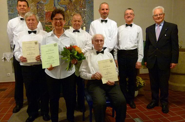 An erster Stelle gab es eine seltene Auszeichnung. Seit 65 Jahren ist Albert Hirsch Chorsänger. Er wurde mit Lob und Urkunden versehen. Auch der Verein selbst erhielt die Urkunden des Deutschen Chorverbandes und des Fränkischen Sängerbundes. Für 25 Jahre Chorleitertätigkeit wurde Simone Gutwein geehrt, für 25 Jahre Singen Sandy Kestler und Gerold Kräußlich sowie für 50 Jahre Klaus Ruppert. Zweiter Vorsitzender Matthias Helmprobst dankte dem Vorsitzenden Heinrich Stelzer für 30 Jahre hervorragende Vereinsführung. Jacobi selbst meinte, dass der Abend in der Kirche ein Sinnbild der Herzlichkeit sei und Singen wie ein Gottesdienst und wie ein Atmen der Seele sei. Er betonte, dass die Gesangvereine ein menschliches Miteinander verkörperten.