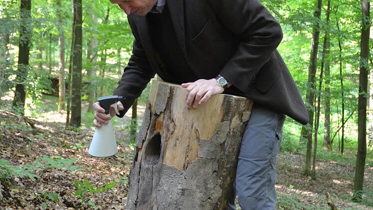 Im Waldstück Hölle fanden Zahner und seine Mitarbeiter geradezu ideale Arbeitsbedingungen. Hier gibt es riesige Buchen, in die der Schwarzspecht gern einzieht. Hoch am glatten Stamm, an dem der Baummarder schwer hinauf kommt, baut er seine Höhle. Er findet zielsicher eine Stelle hinter der die Fäule, die ihm die Arbeit erleichtert, nah unter der Oberfläche liegt. Wenn die bis zu 50 Zentimeter tiefe Wohnung fertig ist, profitiert nicht nur der Bauherr. Mehrere andere Arten wie Hohltaube, Raufußkauz, Meisen und Fledermäuse nutzen die Höhle oft gemeinsam mit dem Specht. "Man könnte schon fast von sozialem Wohnungsbau sprechen", sagte Helmut Brunner.