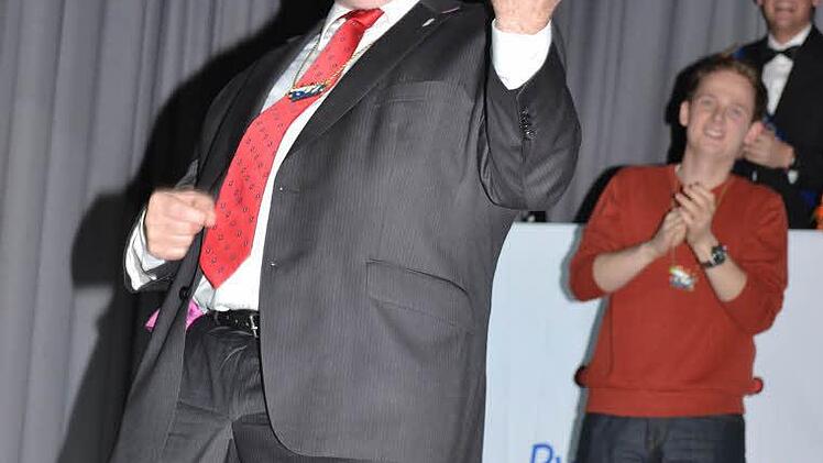 Die Show-Tanzgruppe rockte wild nach Rock- und Pop-Hits über die Bühne, und dann kam das große Ereignis, das quasi vorbestimmt war. Wer spielt die beste Luftgitarre? In den Ring traten Tobias Ehrlicher, Landrat Michael Busch und aus der Elferratsriege Matthias König Dumser, der ungekrönte deutsche Meister auf der Luftgitarre. Klar, legten sich die Politiker mächtig ins Zeug, schwitzen und klampften, gaben alles und verloren doch. Schließlich rockte Matthias mit dem Landkreis-Schlüssel, "Passend zum Landrat", der konterte: "Ich geh‘ halt in meinem Amt auf."