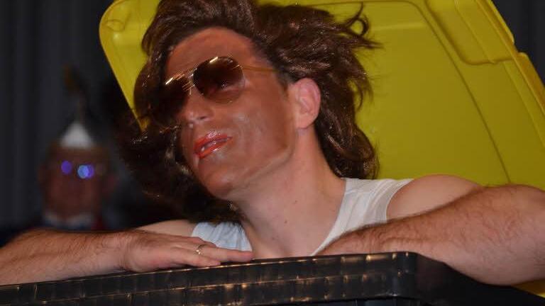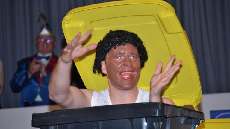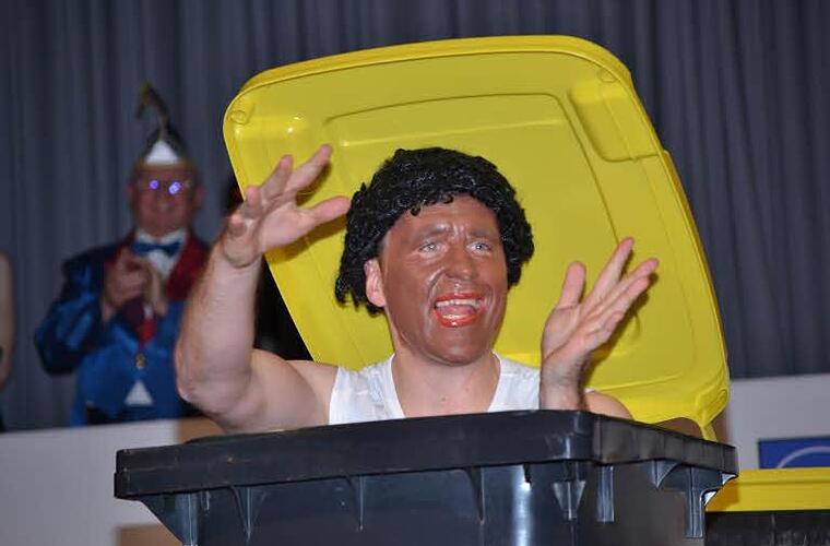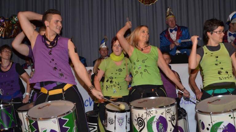 Im Radicher Dialekt nahm Herbert Müller als Müllmann die "Dracksarbet" unter die Lupe, wühlte im Dreck der Kommunen, vom "Hundsfall" über Büstenhalter und Heringsdosen bis hin zu leeren Spirituosen und wähnt manchen Politiker hier beim Drecks-Aufräumen an der besseren Stelle denn auf weichen Sesseln. Mit ihrem Mülltonnen-Blues setzten die Elferräte Matthias, Christian, Sebastian und Arne das erste große Highlight, dem sogleich ein weiteres folgte. Die Coburger Samba-Truppe Aipalé ließ die Wände wackeln. Aipalè hatte die Samba-Rhythmen schier für sich gepachtet, mit Spaß am Trommeln, an akrobatischen Einlagen und an der Musik. Und das war die erste Zugabe des Abends - vom Publikum lautstark eingefordert! Dann folgte ein Bommel-Feuerwerk dem nächsten.