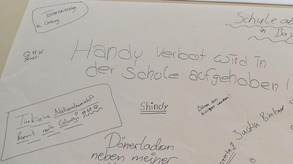 Coburg" ebenso wie "Frieden in aller Welt". Viele hatten aber Nachrichtenwünsche wie "Handyverbot wird in der Schule aufgehoben", "Schule ab 9 Uhr in Bayern" oder "Türkische Nationalmannschaft kommt nach Coburg". Manche waren ganz bescheiden: "Kleine Gamescom in Coburg" oder eher praktischer Natur: "Dönerladen für Wüstenahorn", oder "Dönerladen neben meiner Wohnung (Danke)". Am häufigsten wurde gewünscht, dass eine Überschrift ein Konzert ankündigt. Da reichte die Wunschliste von "187 Straßenbande" über "Shindy" bis "Mina" und "UFO 361 Digga". Vielleicht werden die Wünsche ja mal für die Sommerkonzerte auf dem Schlossplatz aufgegriffen. Dann machen wir gern die passende Schlagzeile dafür.