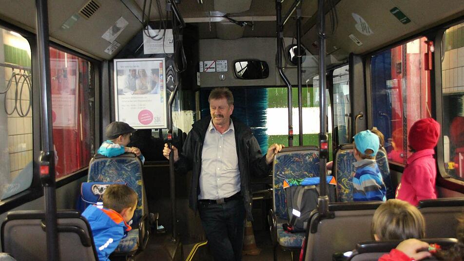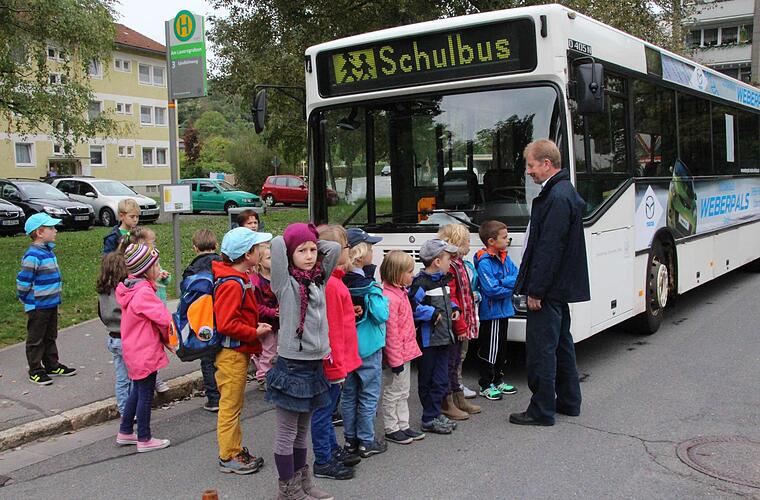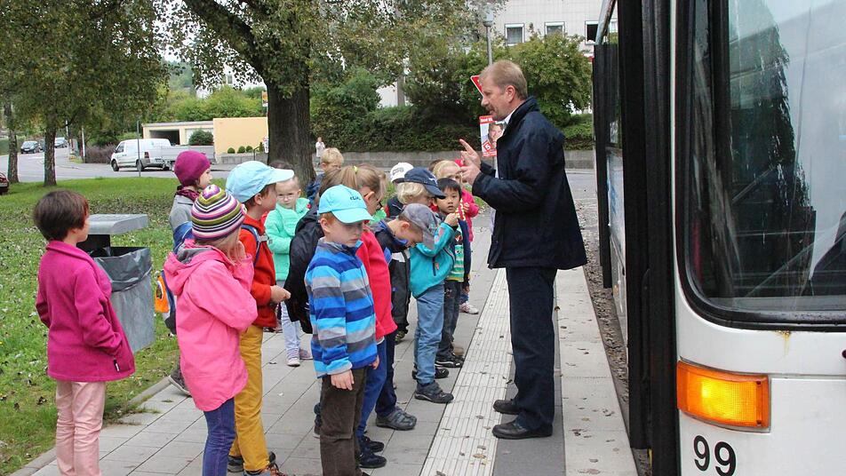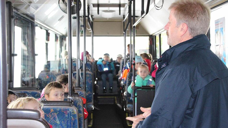 Bei Regina Batyi und Markus Guck vom Coburger Verkehrsbetrieb lernen die Erstklässler, wie sie sich an der Haltestelle und im Bus richtig verhalten - und dass sich der Busfahrer freut, wenn er morgens freundlich gegrüßt wird.