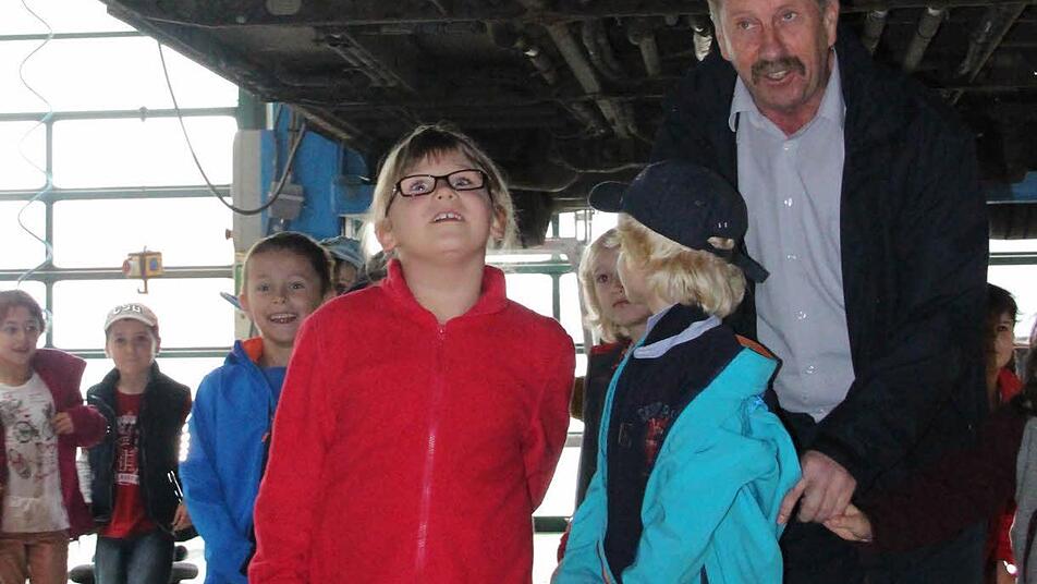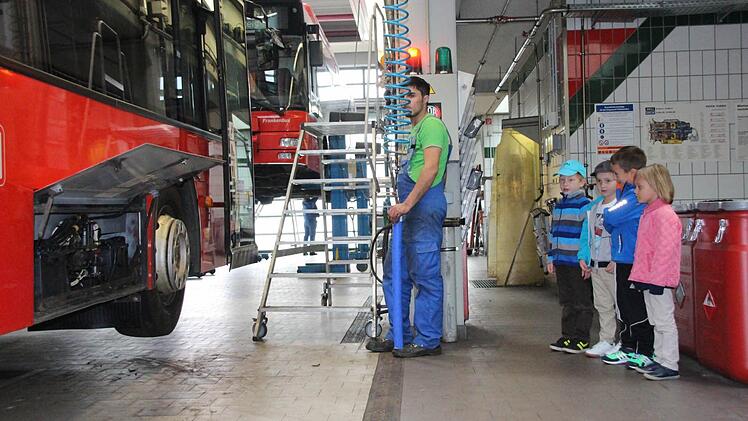 Ein Bus ist auch ganz schön groß. Allein schon die Reifen sind fast so hoch wie die Kinder, wie sie in der Werkstatt sehen können. Dort dürfen sie auch unter einem Bus hindurchlaufen, der gerade auf der Hubanlage steht. Da malt sich Respekt in die Gesichter. "Hoffentlich hält das", wispert ein Mädchen. Aber Markus Guck läuft ja auch untendrunter durch, der muss es ja wissen. So richtig spannend aber wird es, als der Bus voller Kinder in die Waschanlage fährt. Jeder Bus wird jeden Tag einmal mit Regenwasser gewaschen. Vorher muss Markus Guck aber die Spiegel abmontieren, damit da nichts kaputtgeht.