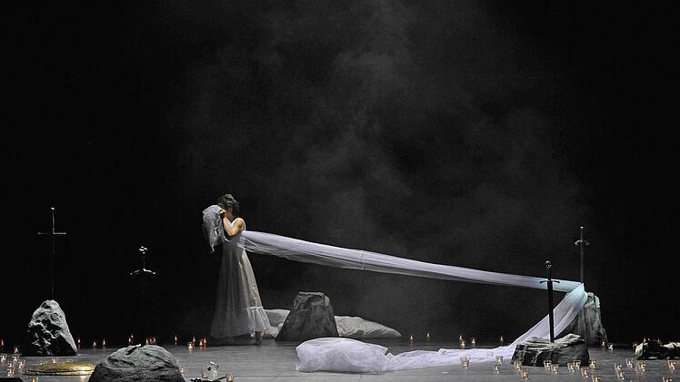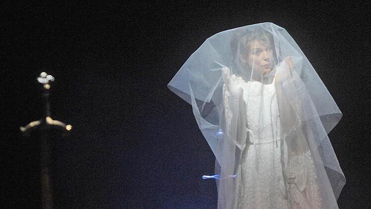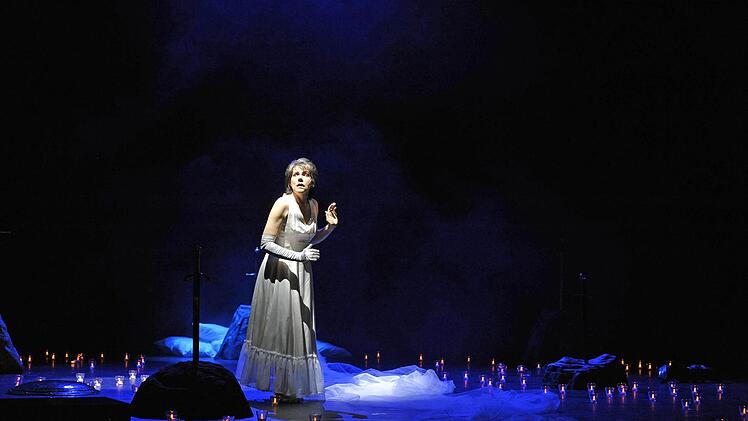 Sciarrinos "Lohengrin" hat Coburgs Intendant Bodo Busse genau drei Wochen nach der gefeierten Wagner-Premiere auf die Bühne des Landestheaters gebracht. "Unsichtbare Handlung" - diesen Untertitel von Sciarrinos Werk nimmt Busse als Leitmotiv für seine Deutung, die auf jeden unnötigen äußeren Aufwand verzichtet. Vier Schwerter samt Schild, ein endlos langer Brautschleier, ein Meer flackernder Kerzen auf schwarzem Boden, dazu ein Reisekoffer am linken vorderen Bühnenrand - das sind die symbolschwer aufgeladenen Requisiten, die Bodo Busse für seine Ausstattung ausgewählt hat. Mit genauem Gespür für die Ausdruckskraft kleiner Gesten lässt Busse seine prominente Gastsolistin Salome Kammer agieren.
