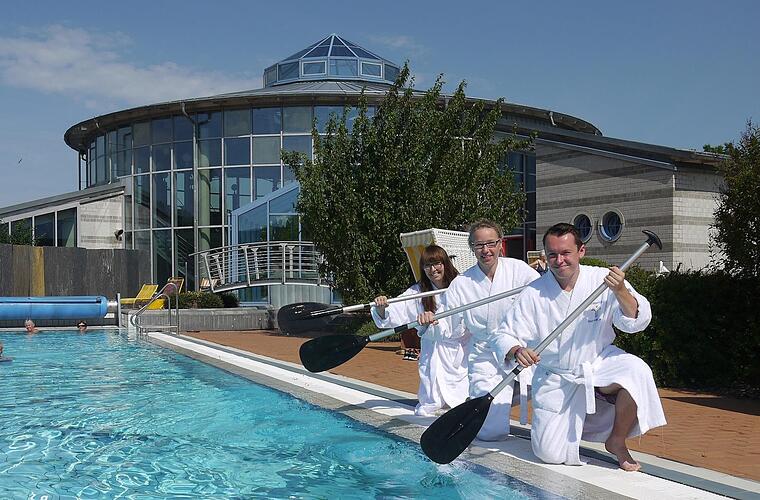Für ein Thermalbad ist so ein Drachenboot-Tauziehen eine nicht alltägliche Angelegenheit: Nancy Grau rechnet mit gut 100 Ruderern, Fans und Familienmitgliedern, die am Samstag in die "Therme Natur" kommen werden. Sie bekommen nicht nur den gaudi-sportlichen Wettbewerb, sondern auch jede Menge Unterhaltung drumherum geboten: Es gibt Live-Musik, dazu wird auf dem Freigelände neben dem Schwimmerbecken gegrillt. "Der Abend wird für alle - Aktive, Zuschauer und die anderen Badegäste - eine Akttraktion", verspricht Marketingleiterin Grau.