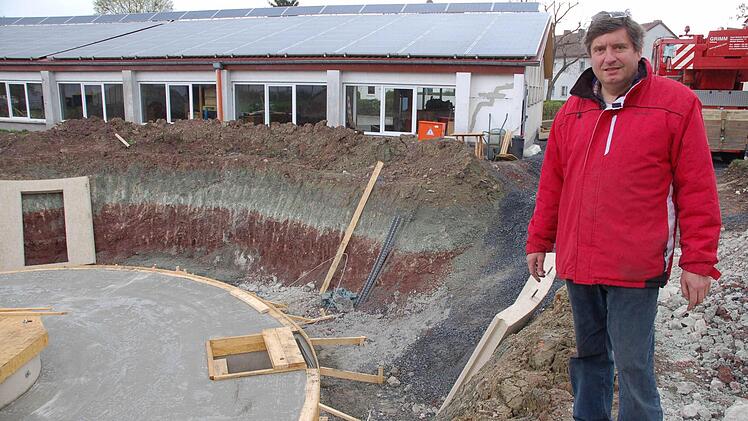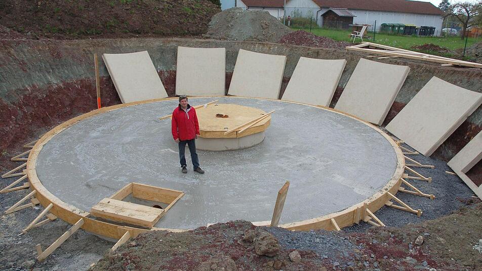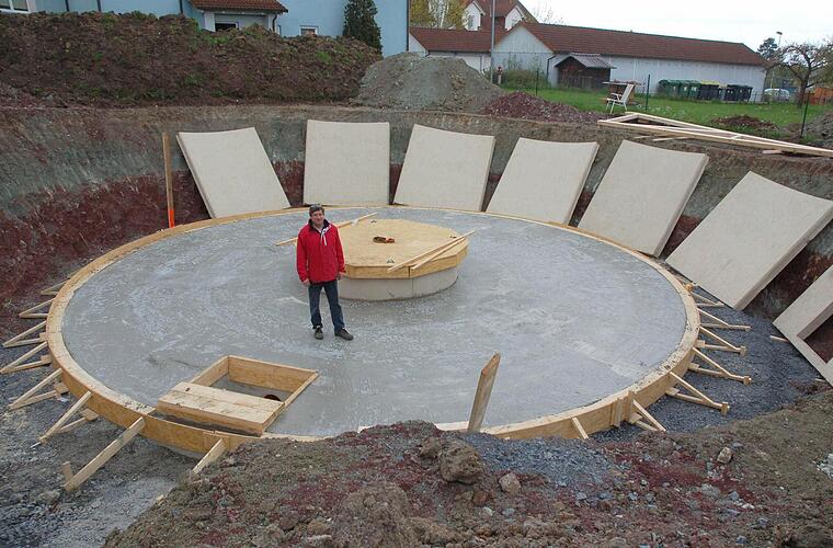Als Rolf Friedenstab dieIdee hatte, ein Haus zu bauen, das sich dreht und immer der Sonne zuwendet, wusste er noch nicht, dass es schon einen Anbieter gibt, der genau solche Häuser baut. Als er auf die Firma Rinn Haus in Gießen stieß, war der Entschluss schnell gefasst. Rinn bekam den Auftrag, für ihn in Einberg so ein Haus zu bauen. Die kreisrunde Bodenplatte sitzt schon in der Baugrube.
