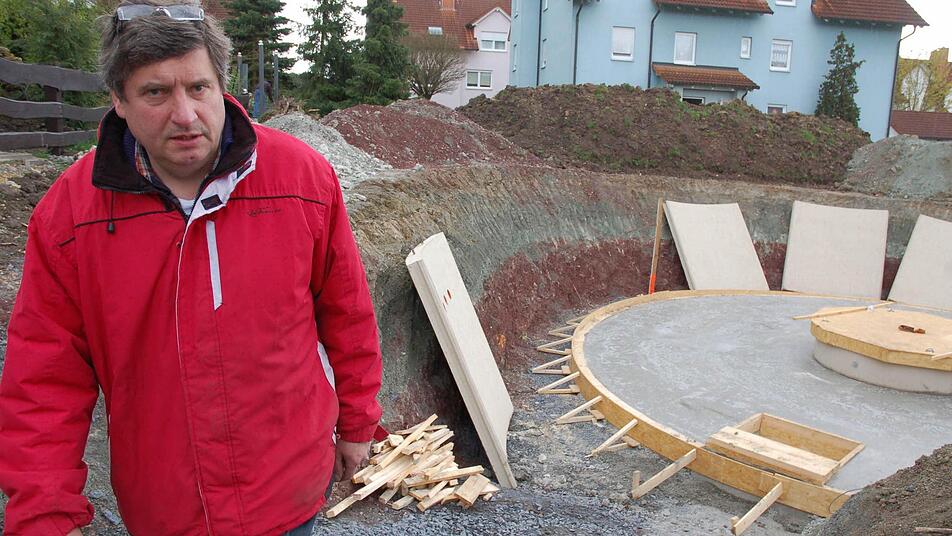 Die Seitenteile für die Wände des Kellers wurden am Donnerstag geliefert und rund um die Bodenplatte aufgelegt. "Der Beton der Bodenplatte muss aushärten", erklärt der Bauherr. Dann wird es schnell gehen, mit dem Bau des "Drehhauses".