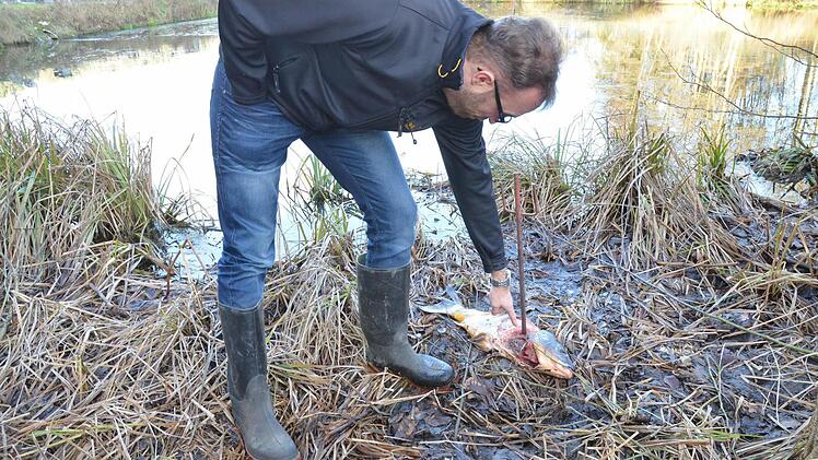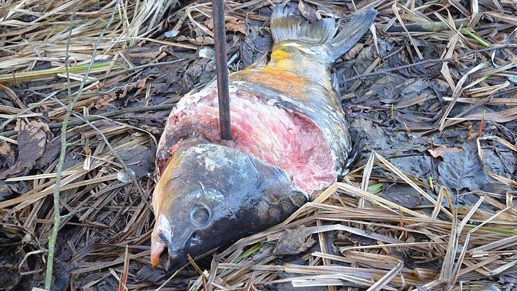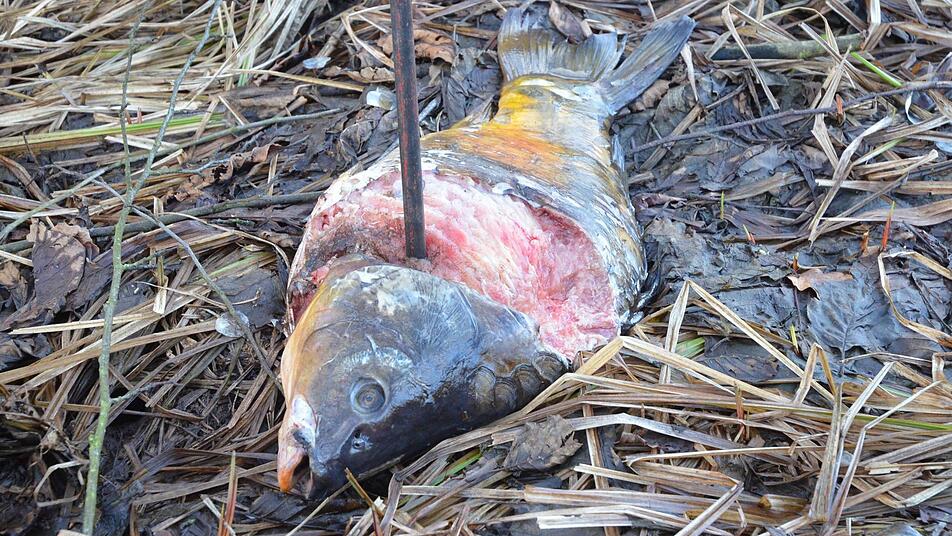 "Ich habe so etwas in den vergangenen 20 Jahren noch nicht erlebt", sagt Mozzo. Daher hat er sofort Bürgermeister Markus Mönch (parteilos) über den Fund informiert, der kein Einzelfund ist. Rund um den Klärteich fielen Mozzo am Donnerstag tote Karpfen auf. Alle liegen nah am Wasser. Alle wurden vom Kopf her angefressen.