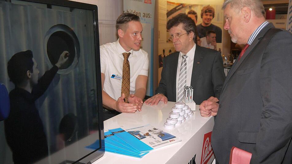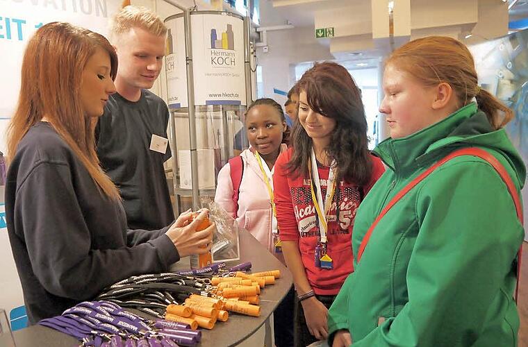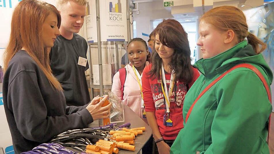 Julia und Tony haben ein stressiges Wochenende. Die beiden Auszubildenden beim Creidlitzer Kunststoff-Spezialisten Hermann Koch stehen am Stand ihrer Firma bei der Berufsbildungsmesse im Coburger Kongresshaus. Dort erklären sie interessierten Jugendlichen, was sie während ihrer Ausbildung bei Koch alles so machen. Die Führungskräfte aus dem Unternehmen halten sich dabei im Hintergrund. "Es ist wichtig, wenn die Schüler mit unseren Auszubildenden jemand haben, mit dem sie auf Augenhöhe reden können", sagt Melanie Krempel von der Marketingabteilung bei Koch.