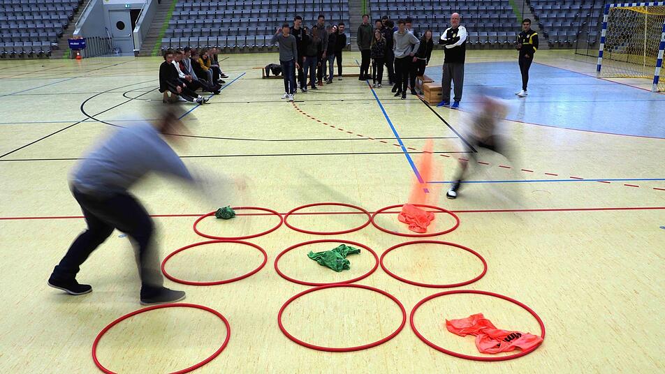 Abschließend treten die vier Gruppen in einer Staffel gegeneinander an: Bunte Leibchen müssen in Reifen platziert werden. Jedes Teammitglied muss sprinten, muss ganz bei der Sache sein, um zu gewinnen. "Erfolg ist ohne Regeln nicht möglich", sagt Martin Röhrig.