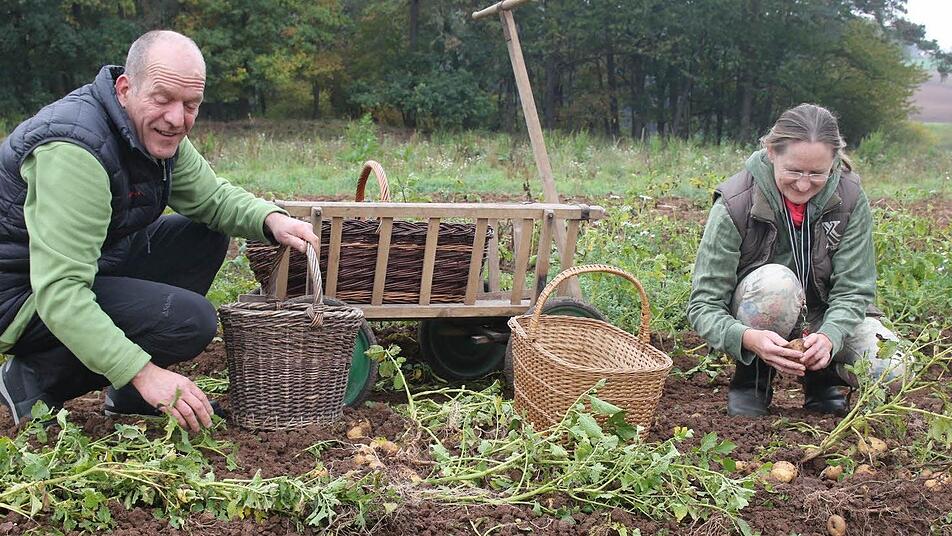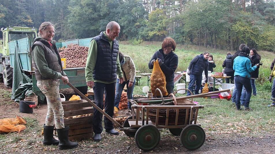 Daniel und Jessica Hennig kamen mit einem alten Handwagen zum ersten Kartoffelfest zwischen Rohrbach und Grub. Sie marschierten gleich in den Kartoffelacker der Familien von Hans-Ulrich Brehm und Manfred Bürger aus Grub am Forst, um dort die Knollen, die zuvor herausgeschleudert worden waren, aufzulesen. Köstliches kam im Feld zum Vorschein: alte Sorten wie die "Rote Laura" (eine festkochende Speisekartoffel mit tiefgelbem Fleisch) und die "Granola" (eine Kartoffel mit erdigem Geschmack, die sich auch gut lagern lässt). Die Bürgers und die Brehms haben dafür gesorgt, dass auf einem viertel Hektar die besonderen Erdäpfel wachsen konnten.