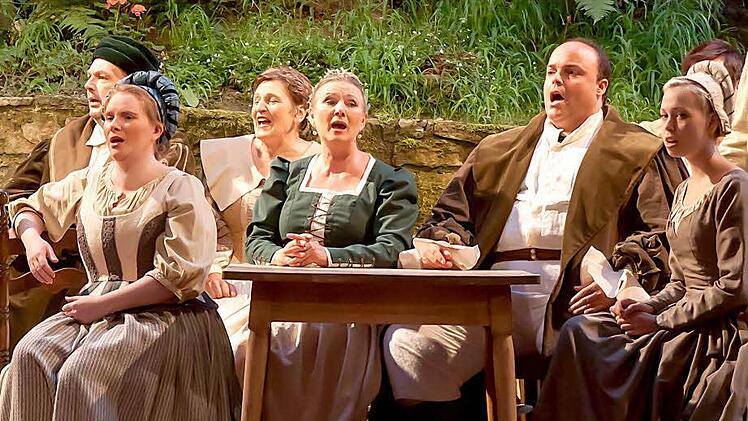 Umbaupausen in stumme Szenen verwandelt Diese gestaffelten Kulissen freilich brauchen Platz. Auf der nach hinten rasch ansteigenden Spielfläche der Naturbühne sind deshalb manche Szenen von seitlichen Sitzplätzen aus nicht vollständig einsehbar. Der ungetrübt freundlichen Stimmung im Publikum freilich tut das keinen Abbruch. Zudem lässt Lang immer wieder die gesamte Breite der Bühne bespielen, verwandelt auch die kleinen Umbaupausen auf offener Bühne in kleine stumme Szenen.
