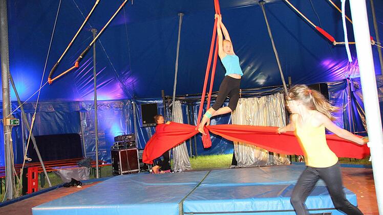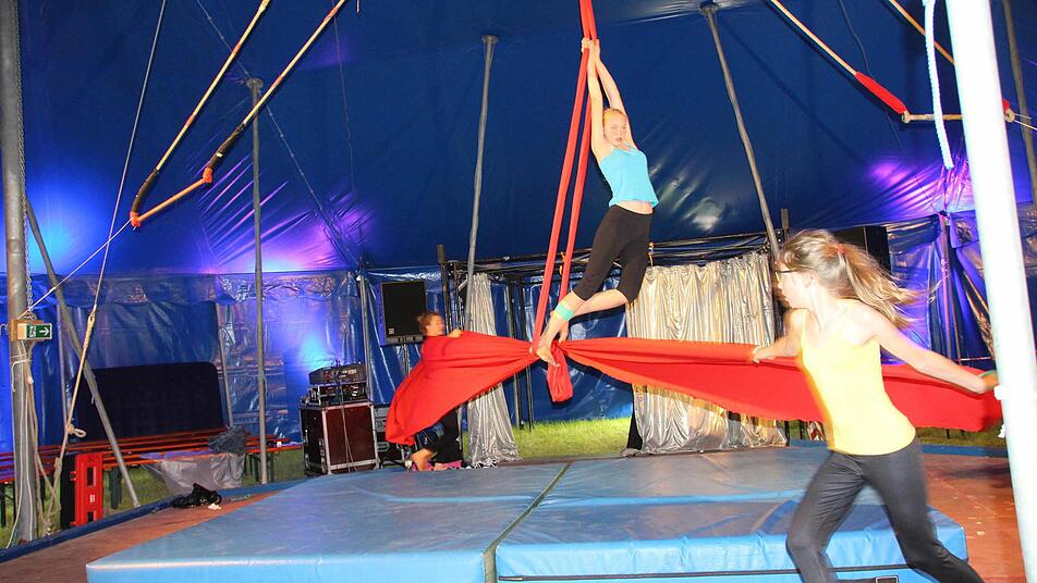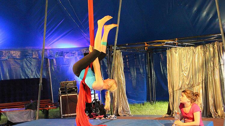 Im Moment laufen in der Manege noch die Vorbereitungen an Trapez und Vertikaltuch auf Hochtouren. Die 13-jährige Jennifer Sauerland hängt am roten Tuch und übt den Feldaufschwung.