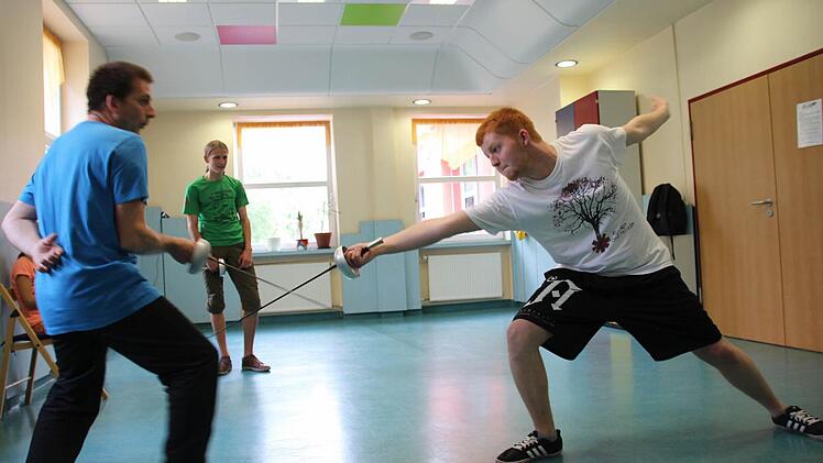 Zum Beispiel der 18-jährige Christof Stier und der 19-jährige Dominik Tippelt. Die beiden stehen sich gegenüber, Degen in der Hand, höchste Konzentration. "Prim, Prim, Terz", kommandiert der Leiter des Schaukampf-Workshops Oliver Sproll. Macht das Training Spaß? "Es ist richtig cool!", meint Christof Stier mit Blick auf seinen Lehrer, der scherzhaft drohend die Waffe hebt. "Nein wirklich. Wenn man Fechten im Fernsehen sieht, geht alles immer so schnell. Hier lernt man, was eigentlich dahintersteckt."