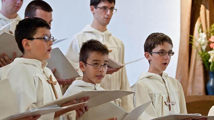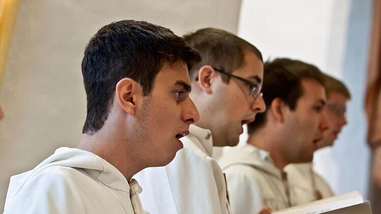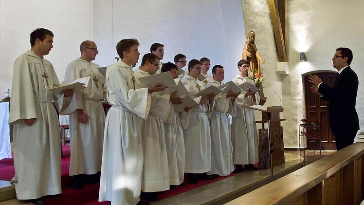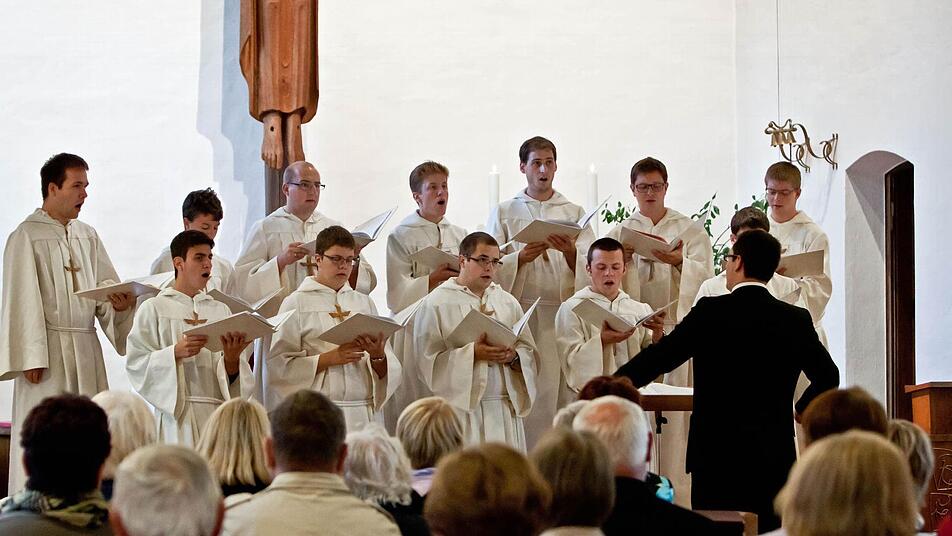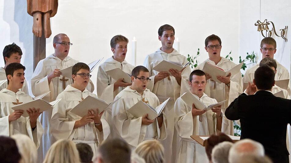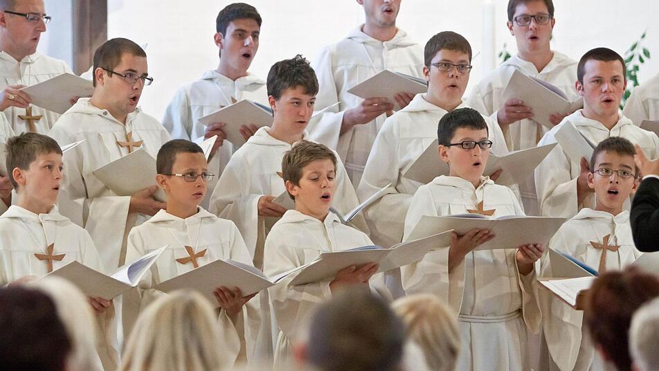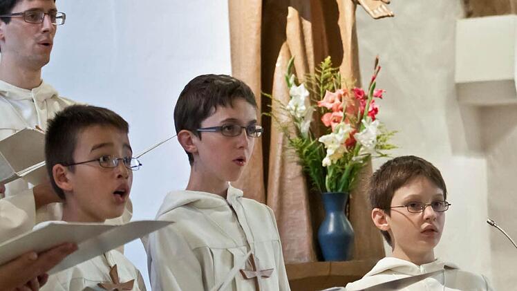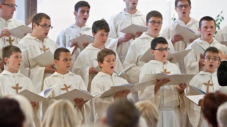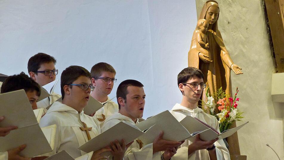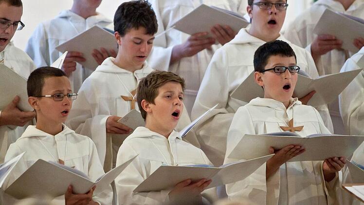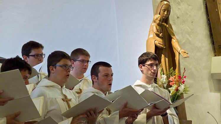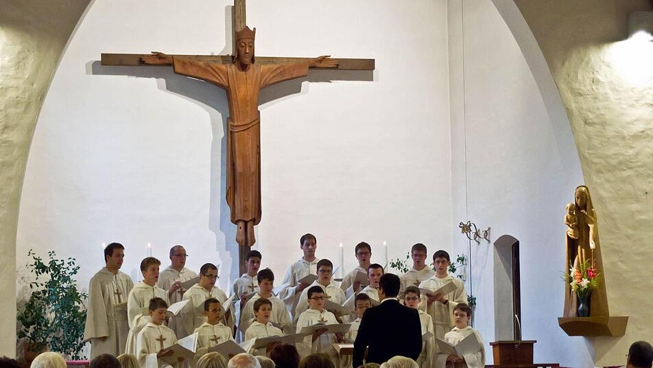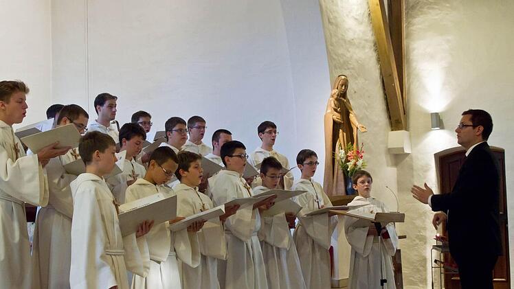 Maria mit dem Jesuskind hat vielstimmigen Besuch an diesem Abend. Zu Füßen der Marienfigur am rechten Rand des Chorbogens von St. Hedwig in Rödental nimmt am Tag vor Mariä Himmelfahrt ein junger Chor aus der Schweiz Aufstellung - die "Maîtrise de Fribourg", die Freiburger Sängerknaben.
