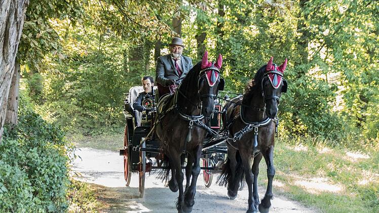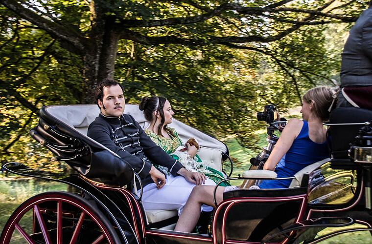 Weil sich freilich eine Kutschfahrt im Riesensaal nicht live darstellen lässt, sind Marie-Sophie Weidinger und Valentin Fruntke schon mal vorab in die Kostüme von Victoria und Albert geschlüpft und nehmen Platz in der Kutsche für einen Videodreh.