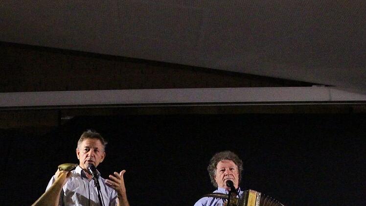 Des Schönste bei denen ist ja aber, dass die sich in ihren Spottliedern immer auch ihren Auftrittsort vornehmen. Mitgekriegt haben sie, dass der Landrat Straubel rigoros tut, was er mag. Des einzige is, dass er vorher den Stoschek fragt. Och übrigens, wenn des mit dem Kastner und dem Stoschek nicht endlich aufhört, dann wird am ehemaligen Schlachthof a Uno Blauhelm-Truppe installiert.