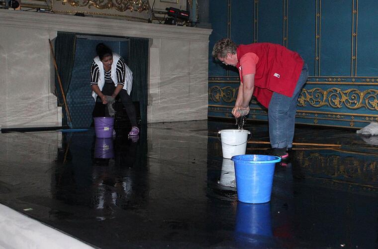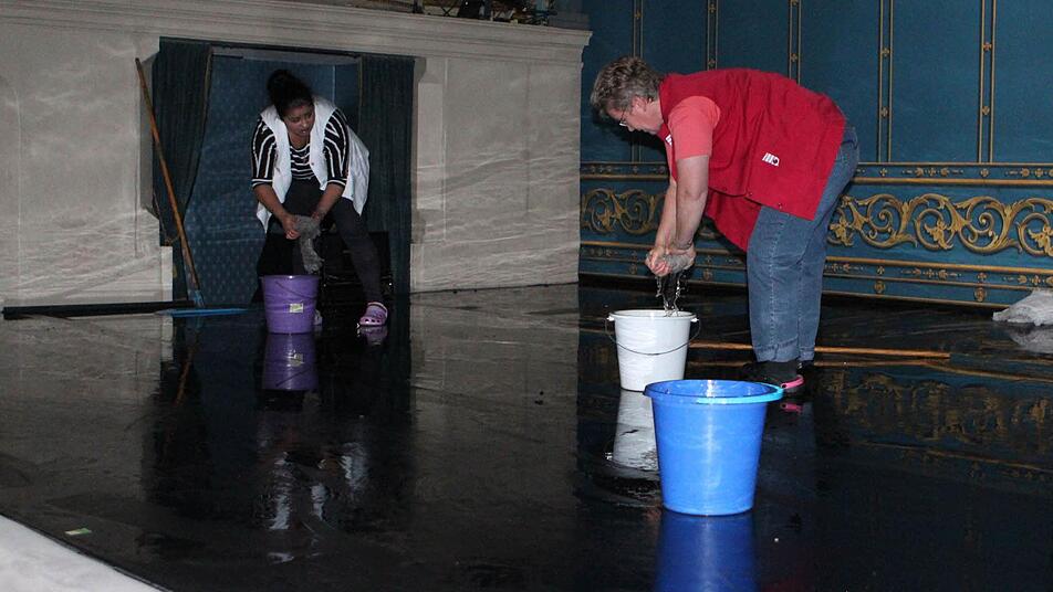Eimerweise wird die schmutzige Brühe nach draußen getragen, bevor schließlich die Feuerwehr zu Hilfe kommt. Wegen der Überflutung muss vorsorglich der Strom abgeschaltet werden. Mit Taschenlampen versuchen Theatermitarbeiter, sich einen ersten Überblick über das Ausmaß der Schäden zu verschaffen.