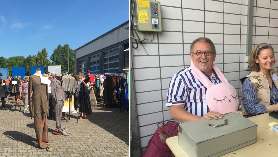 Gewandmeisterin Anna Rudi und Ensemble-Schauspieler Frederik Leberle haben sich unter die Menge gemischt und beobachtet, wer jetzt im Besitz der ausrangierten Theaterschätze ist.