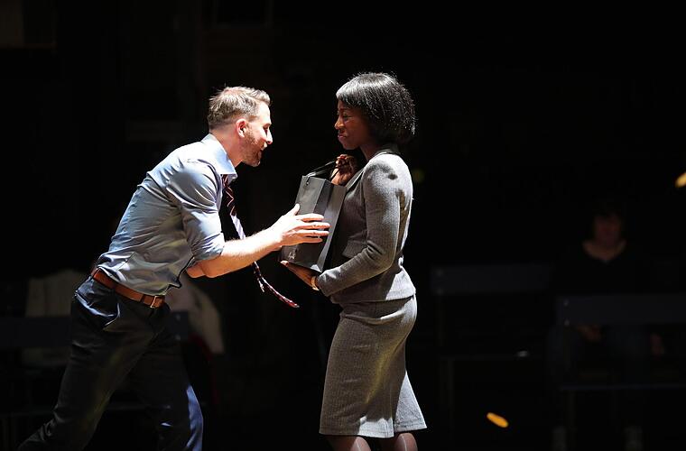 Um die Verstrickung auch im äußeren Rahmen wirken zu lassen, hat Ausstatter Till Kuhnert eine besondere Theatersituation geschaffen. Das Stück wird auf der Drehbühne im Großen Haus inszeniert - und die (pro Aufführung zahlenmäßig deutlich beschränkten) Zuschauer sitzen auf Tribünen unmittelbar drum herum, sind den streitenden Figuren nah wie in einer Arena. Wir hatten das 2009 bei "Die zehn Geschworenen", was damals zu ungemein nahegehenden Effekten führte.