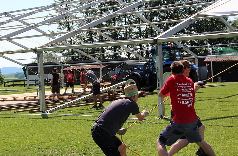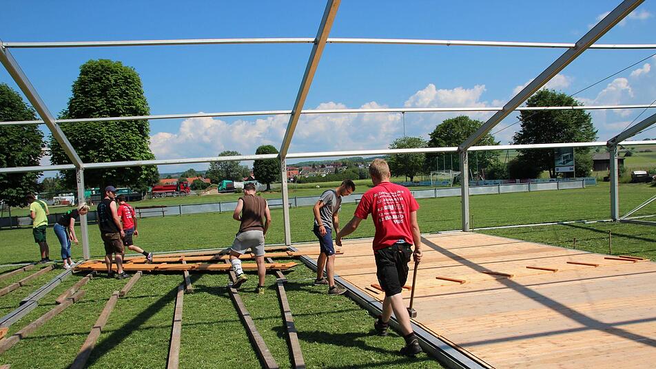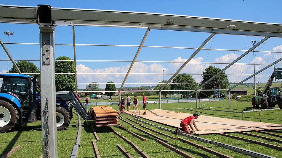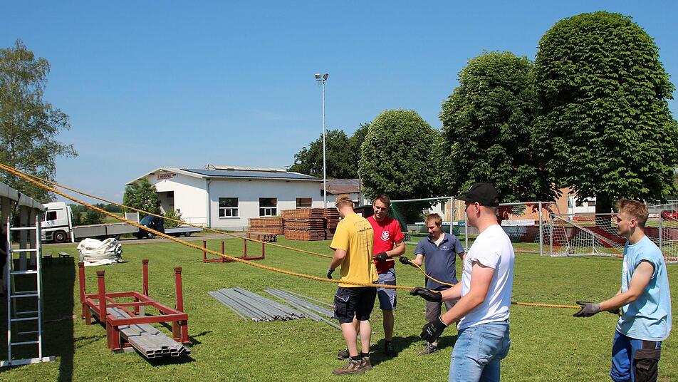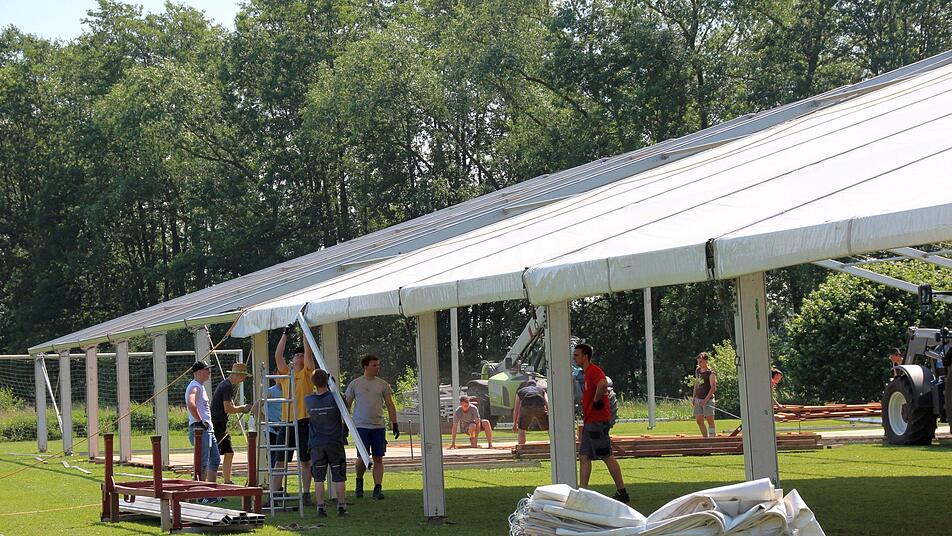 Zum Glück kann die Meederer Landjugend auch noch auf die Hilfe befreundeter Vereine bauen. Der Ottowinder Sportverein und die Neidaer Landfrauen sind am kommenden Wochenende mit bei der Jubiläumsfeier im Einsatz und reduzieren damit den Personalbedarf erheblich. "Aber so 150 Leute", schätzt Benedikt Westhäuser, "werden rund um das Fest schon im Einsatz sein". Schon am vergangenen Samstag haben 40 Freiwillige mit angepackt, um das Zelt aufzustellen. Das Grundgerüst stand schnell, dann kamen die Planen drauf und der Fußboden hinein. Die Woche über ging es an den Feinschliff, wobei Philipp Schramm mit einer Punktlandung rechnet: "Es kann schon sein, dass wir bis Mittwoch noch aufbauen." Es gehe ja schließlich nicht nur ums Zelt - auch die Bar und der Ausschank müssen noch eingerichtet werden. "Bis alles an der richtigen Stelle ist, braucht es schon seine Zeit", weiß der Festausschussvorsitzende.