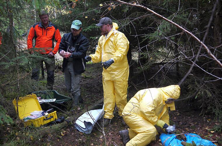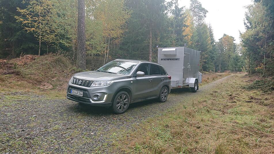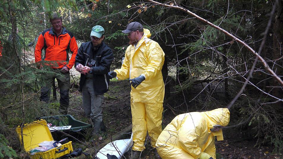 Unterwegs ist ein Bergeteam in gelben Overalls und mit jeder Menge Spezialausrüstung: Auslegefolien, Röhrchen zur Entnahme von Gewebeproben, Desinfektionsmittel und, und, und. Transportiert wird das alles mit einem extra für die Bergung von toten Wildschweinen zusammengestellten Pkw-Anhänger. Dessen Ausstattung hat eine Arbeitsgruppe des Landratsamtes mit Rico Steinmann an der Spitze entworfen. Gezogen wird der Anhänger von einem Fahrzeug aus dem Fuhrpark des Landratsamtes, am Steuer sitzt in jedem Fall ein Fahrer aus einem Bereitschaftsteam, der eine gesonderte Schulung zum Transport von Gefahrstoffen absolviert hat. Die Bergung des toten Tieres übernehmen ebenfalls Mitarbeiter des Landratsamtes, die nach mehrere Schulungen wissen, was sie zu tun haben.