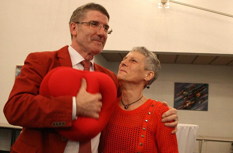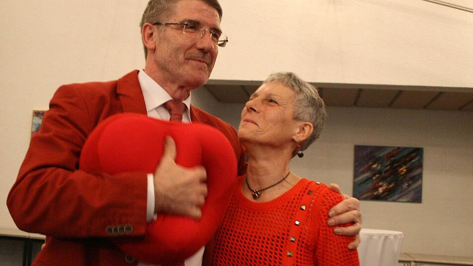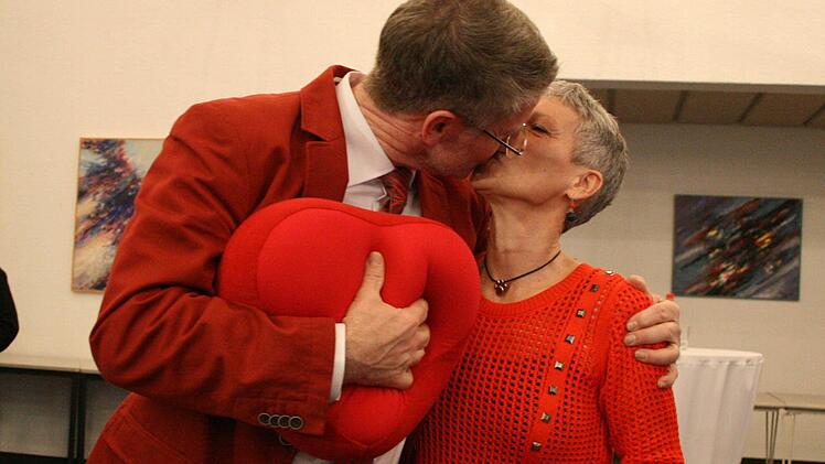 Ein breites Grinsen geht über das Gesicht des Landrats. Bis jetzt wollte er sich nicht gratulieren lassen, doch langsam bricht sein Widerstand. "Erst, wenn die Großen durch sind", sagt er und drückt sein rotes Kissenherz immer noch fest an seine Brust. Sein privates Maskottchen, wie er es nennt, begleitete ihn schon bei der letzten Wahl. Damals, 2008, wollte er selbst eigentlich gar nicht so recht, "aber diesmal schon".