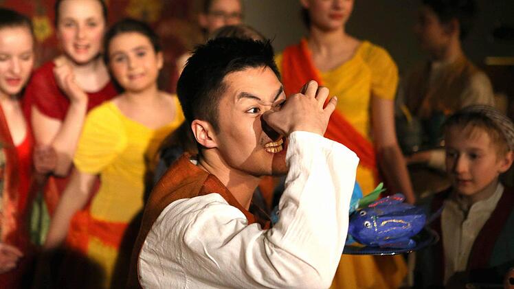 Wie aber wird aus einem modernen Kirchenraum eine provisorische Opernbühne? Susanne Wilszek zaubert dazu mit wenigen Versatzstücken orientalisches Kolorit herbei, unterstützt durch farbenprächtige Kostüme. Dazu haben Schüler der 3. Klassen der Melchior-Franck-Schule bunte kleine Fische als wichtige Requisiten gebastelt.