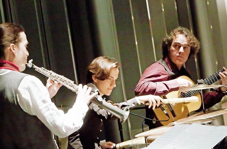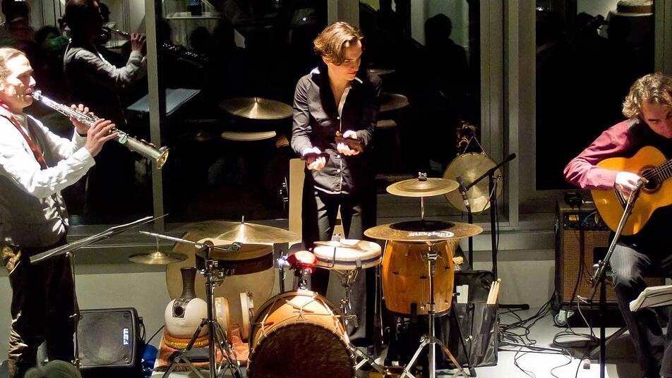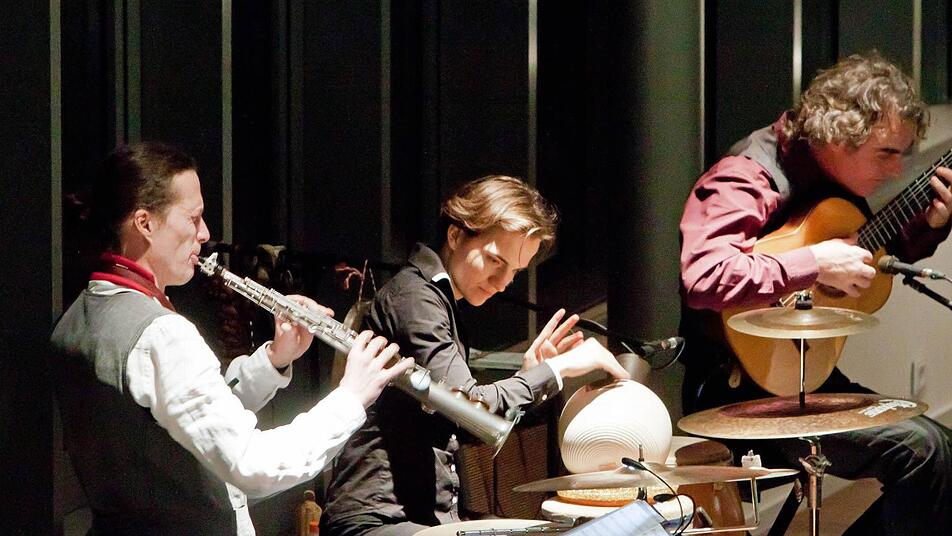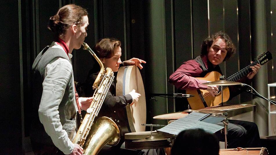 Der Weimarer Gitarrist Falk Zenker, die Leipziger Perkussionistin Nora Thiele und der Berliner Saxofonist Gert Anklam ziehen das Publikum im Glasmuseum mit ihrem farbenreichen und klanglich fein differenzierten Spiel in Bann.