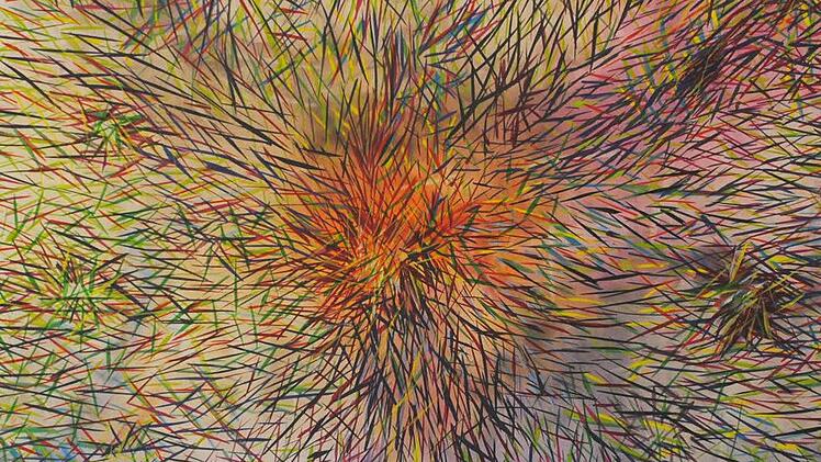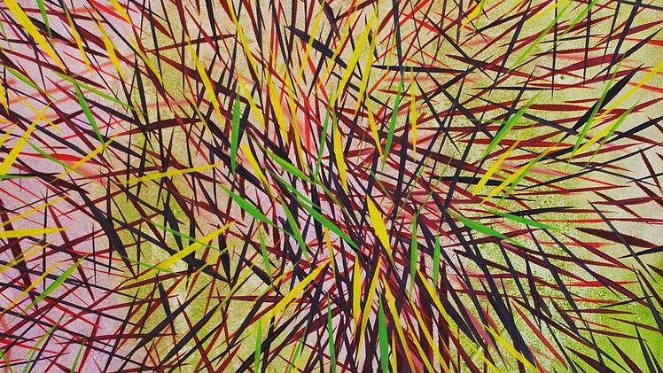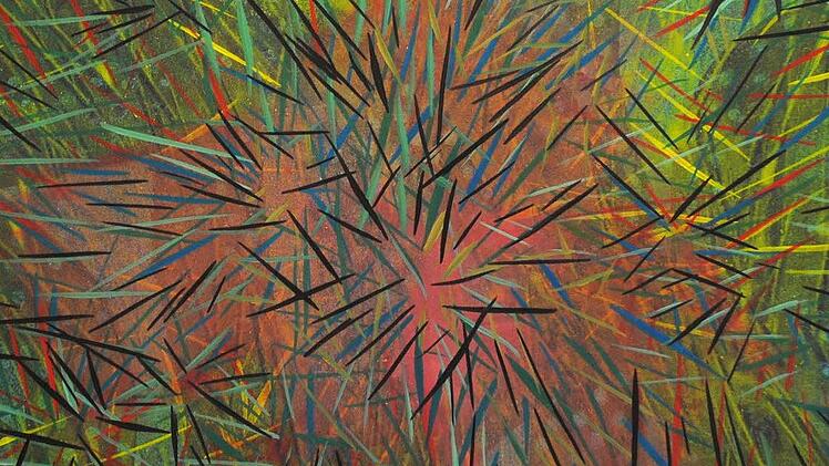 Manchmal deutete er eine Art Fenster an, das Bedürfnis, noch viel weiter "dahinter" zu blicken. Dann kam immer mehr Rhythmus, etwas Tänzerisches in die Gemälde. In den späteren Streifenbildern hat die Luftdruckpistole die Farbe vor sich her und beiseite getrieben. Die Verschiebungen ergeben eigene Farblebendigkeit. Dann wiede rum sind da diese - irgendwie doch in die Natur unserer Welt zurückkehrenden - Bilder, in denen sich feine Lanzettenblätter, Nadeln wie unter Magneteinfluss auszurichten scheinen, ohne ihre relative Freiheit aufzugeben.