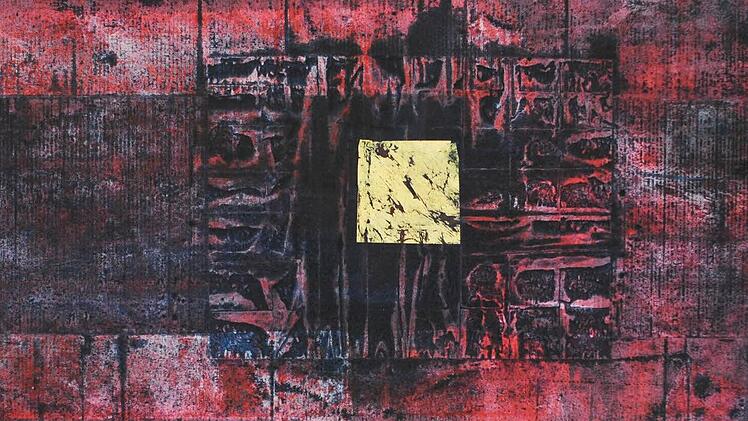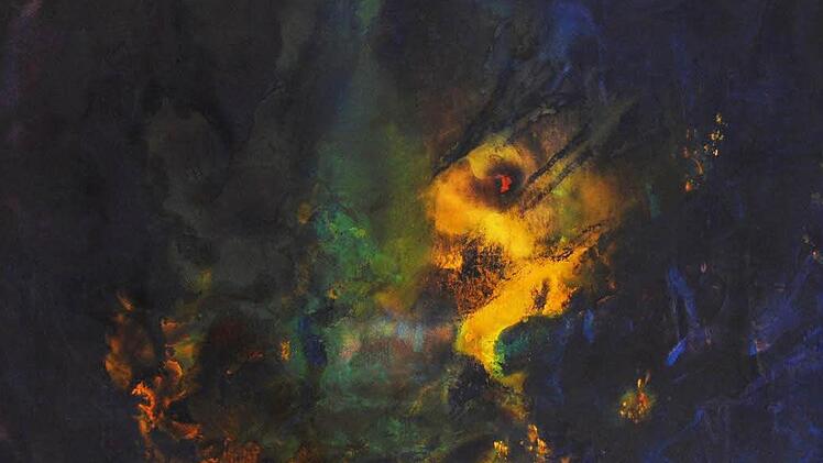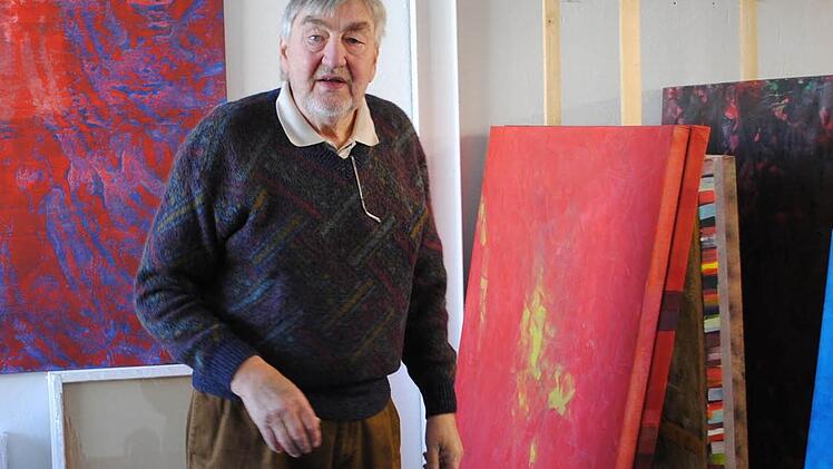 Mittlerweile ist sein durchaus großzügiges Atelier auf dem ehemaligen Goebel-Gelände in Rödental vollgestapelt mit großformatigen Bildern, zweistöckig über die kleine Galerie hinweg. Da bleibt ihm doch tatsächlich nichts anderes, als endlich wenigstens mal auszustellen. Was er ab Samstag jetzt auch tut, und zwar gleich überm Hof in einem ihm und seinen Bildern sehr entsprechenden, schönen Raum mit Ausblick in die Natur, der ehemaligen Goebel-Kantine.