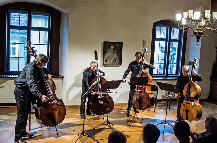 Dass sich auf dem Kontrabass aber gleichwohl verblüffend abwechslungsreich und mit großer Ausdrucksfreude, geradezu beschwingt musizieren lässt, bewies die zweite Matinee in der neuen Reihe der Kammerkonzerte im Coburger Rathaussaal. Auftritt Dietmar Engels, Manfred Wardeck, Christian Ernst und Christian Hellwich. Als Kontrabass-Quartett präsentierte das Kontrabassisten-Trio des Landestheaters gemeinsam mit Christian Hellwich, Vorspieler der Bamberger Symphoniker, ein Programm, das das Etikett außergewöhnlich gleich in mehrfacher Hinsicht verdiente und abwechslungsreich vom Solo-Stück bis zur Suite für Kontrabass-Quartett reichte.