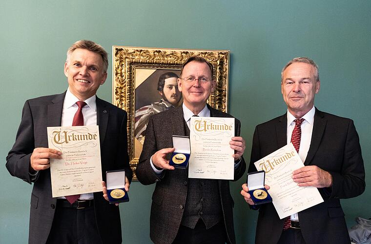 "Ich habe die Fränkische Verdienstmedaille sehr gerne angenommen und fühle mich ebenso wie mein Amtskollege Oberbürgermeister Frank Rebhan außerordentlich geehrt. Wir beide haben die Ehrung stellvertretend für alle Bürger in Sonneberg und Neustadt entgegengenommen, die den Tag der Franken erst durch ihren Einsatz vor und hinter den Kulissen zu einem solchen Erfolg gemacht haben." Mit diesen Worten kommentierte Sonnebergs Bürgermeister Heiko Voigt die ihm am Mittwoch in der Thüringer Staatskanzlei vom Fränkischen Bund erteilte Ehrung.