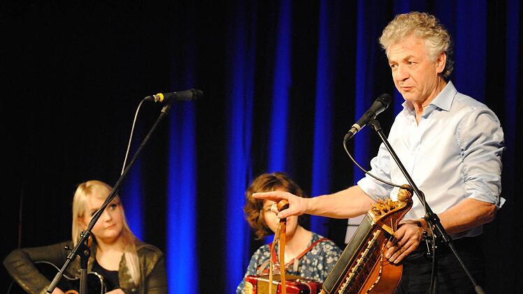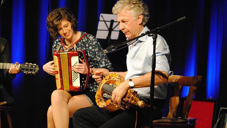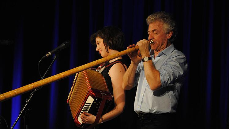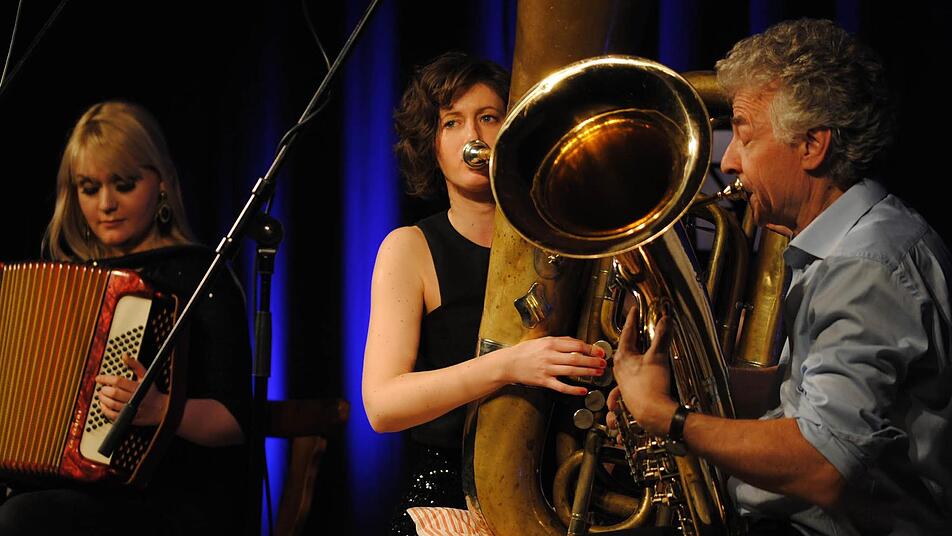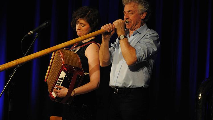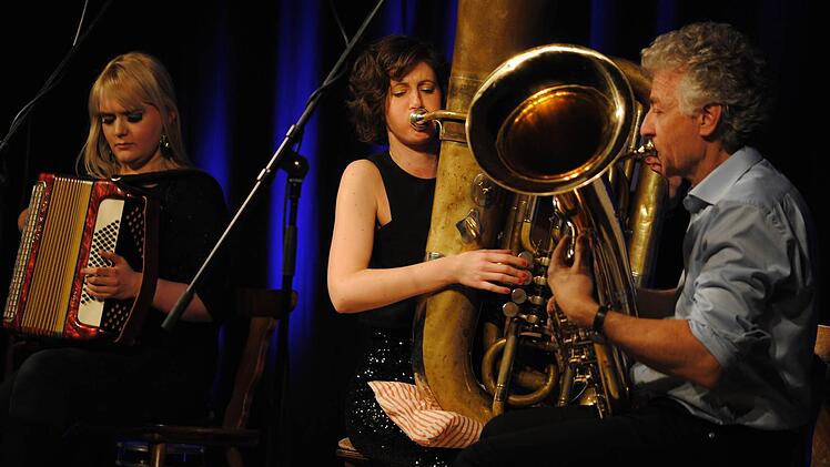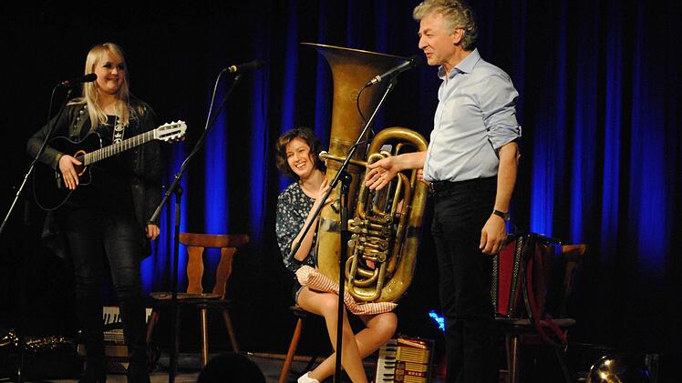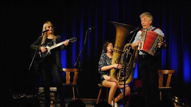 Der Michael legt einem im Publikum den Alphorntrichter auf die Schulter, wie hätt's denn sonst gehen sollen. Die Claudia macht auf Heavymetal, man wuchtet ihr die große Tuba auf den Schoß. Überhaupt zerren die drei eine Vielzahl von Instrumenten auf die Bühne, alles unter dem Vorwand, a echte Stubnmusi zu machen. Der Michael Well ist ja einer von dieser ewig musizierenden, nicht überschaubaren Lehrersfamiliengeschwisterzahl, die, seit es sie derbröselt hat, in immer weiteren verrückten musikalischen Formationen erscheinen wie Irrlichter aus dem Fürstenfeldbrucker Moos.
