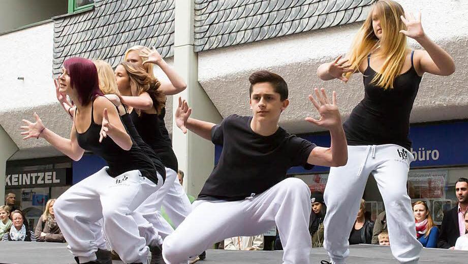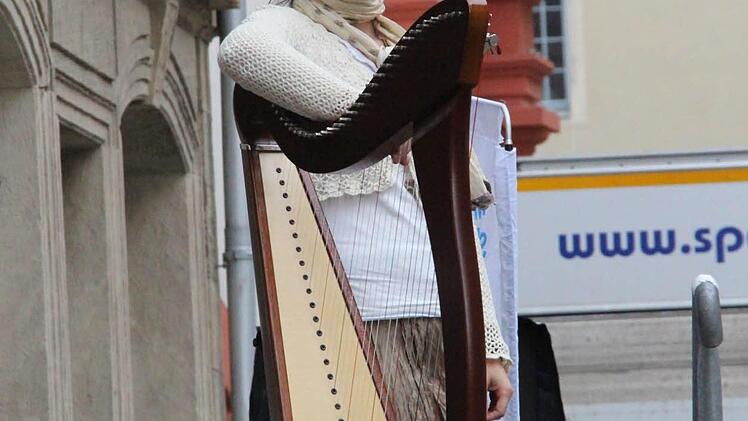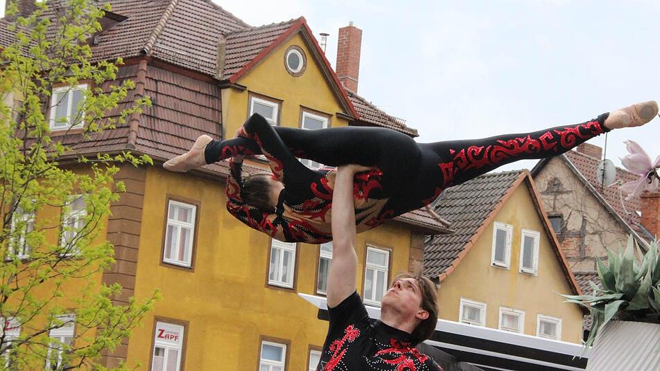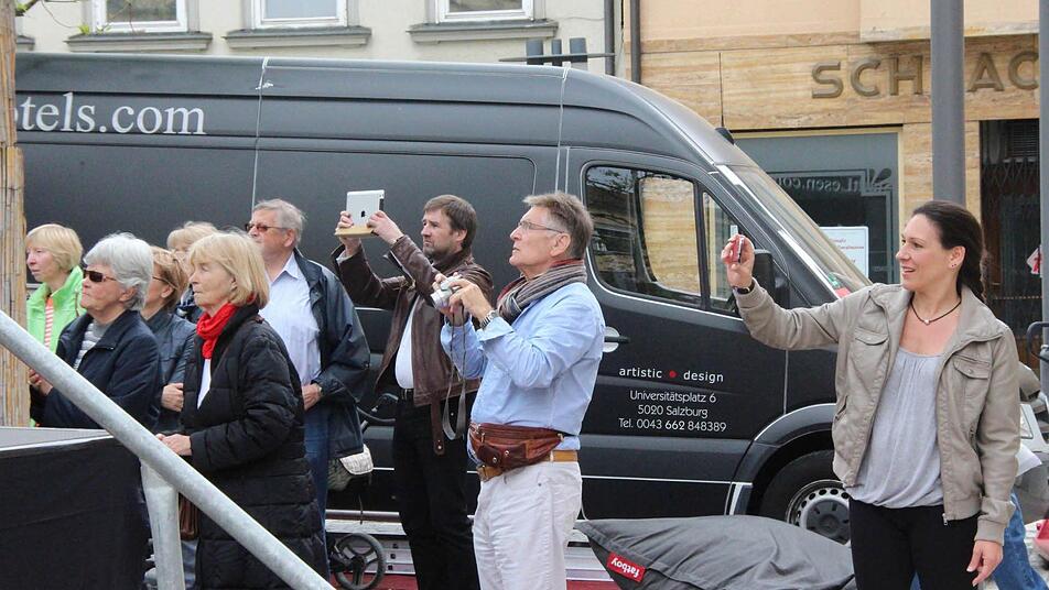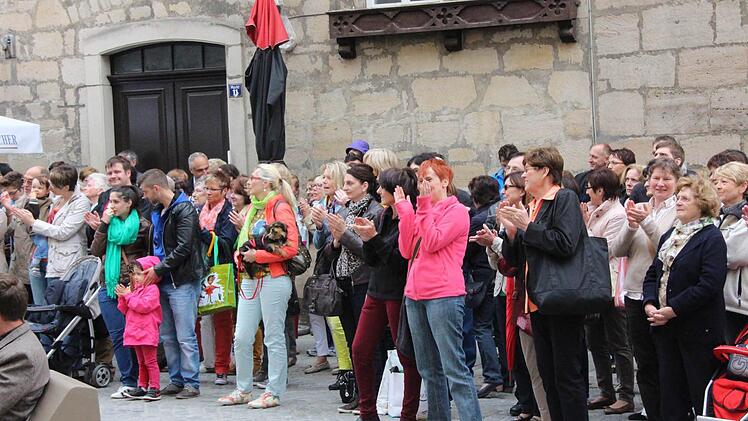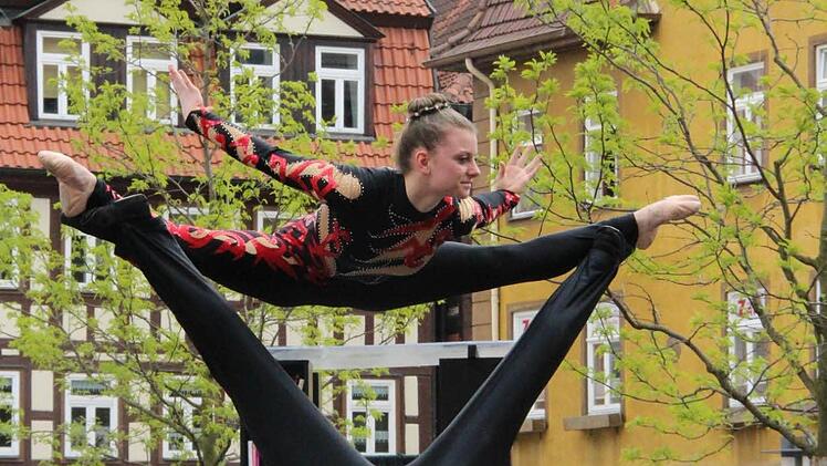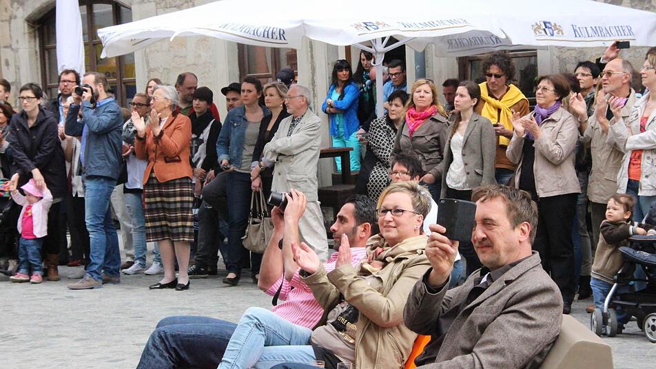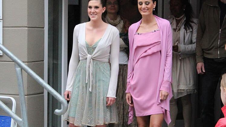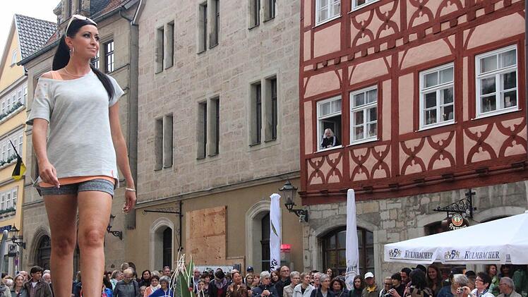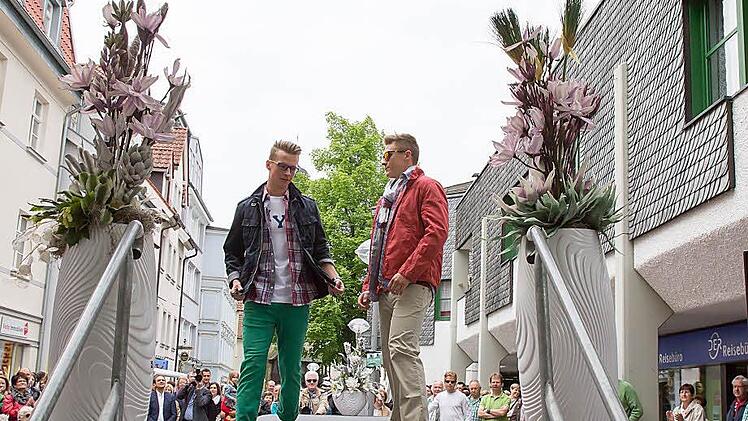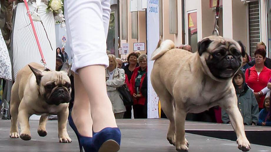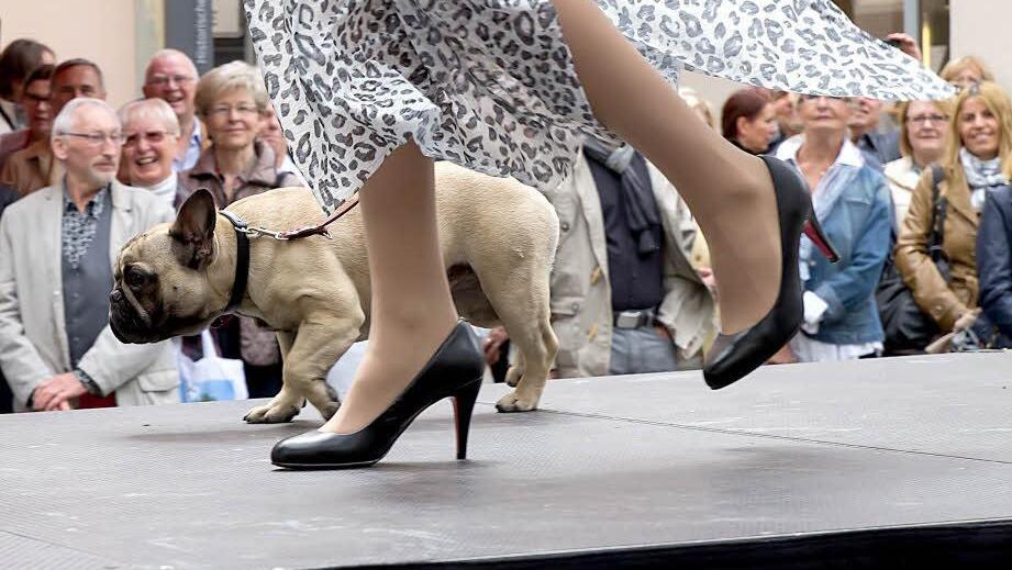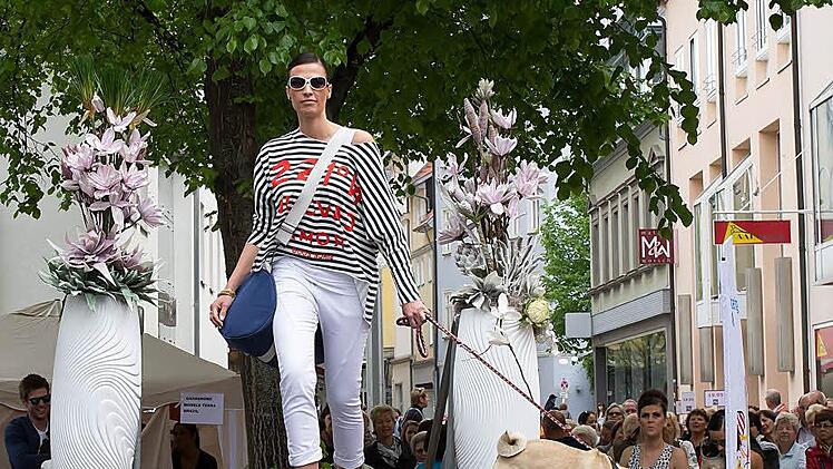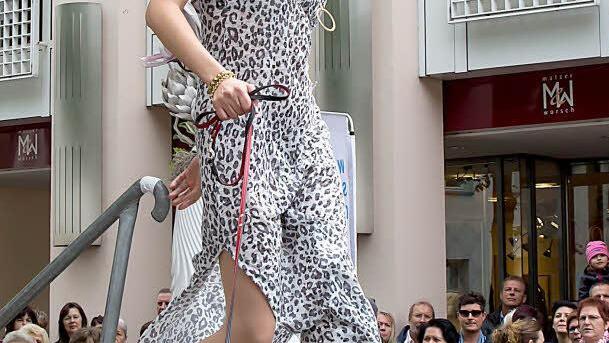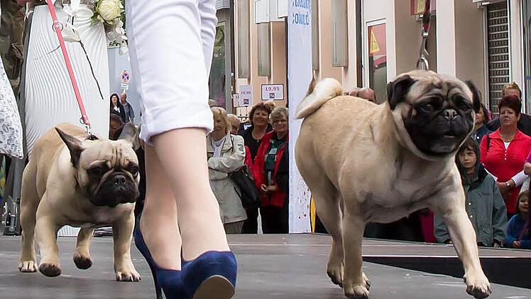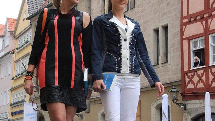 Doch nicht nur Blusen, Röcke, Jeans und Sommermäntel waren auf den Laufstegen zu sehen. "Man trägt wieder Buch", behauptete Moderatorin Uli Noll und hatte nach den Schauen kein Problem, die von einer Coburger Buchhandlung ausgesuchten Bücher unter den lesewütigen Zuschauern zu verteilen. Die Show in der Herrngasse wurde umrahmt vom Spiel der Harfenistin Susanne Globisch. Auf dem Albertsplatz setzten die Sportakrobaten Stefanie Bartulej und David Renner einen raftvoll-anmutigen Akzent. Und auf der Mauer marschierten Möpse mit den Models über den Laufsteg.