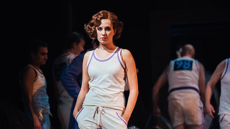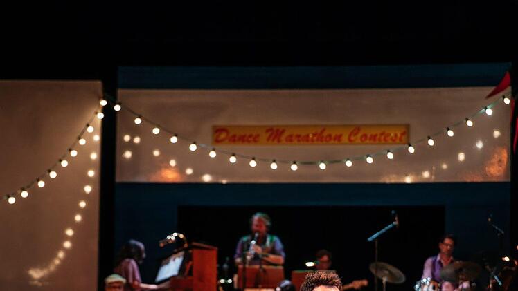 Die mächtig, fast einschüchternd aufragende Tanzhalle hat Gabriele Wasmuth geschaffen. Carola Volles zeigt in ihrer 30er-Jahre-Ausstattung eindrucksvoll den Verfall der Tänzer im Laufe des mörderischen Wettbewerbes.