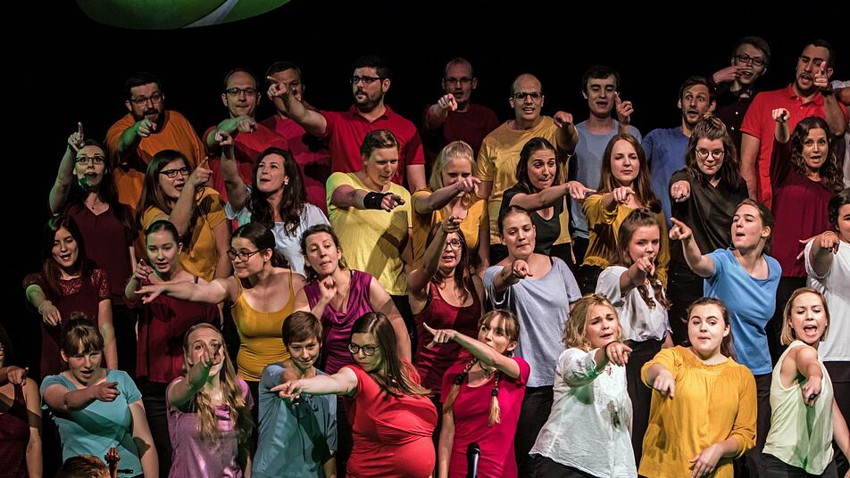 Schon der erste Auftritt aber wurde zur kleinen Inszenierung - denn die Klangfänger bevölkerten die Bühne fein säuberlich nach Jahrgängen sortiert - jeder Choristen-Jahrgang mit einer anderen T-Shirt-Farbe erkennbar.
