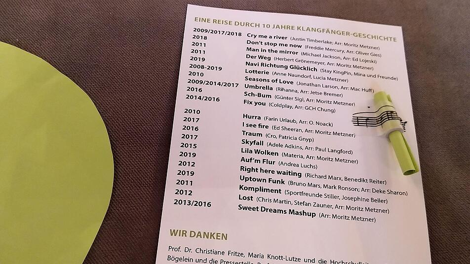 Auch das gehört unverwechselbar zu den Konzerten der "Klangfänger" - die bunten musikalischen Stücke werden immer wieder durch szenische Akzente und durch Wortbeiträge ergänzt. In diesem speziellen Fall: anekdotisch verbrämte Erinnerungen an Erlebnisse aus zehn Klangfänger-Jahren.