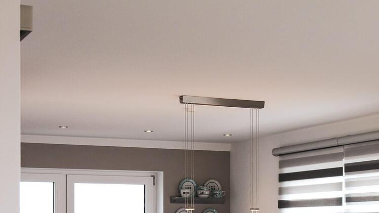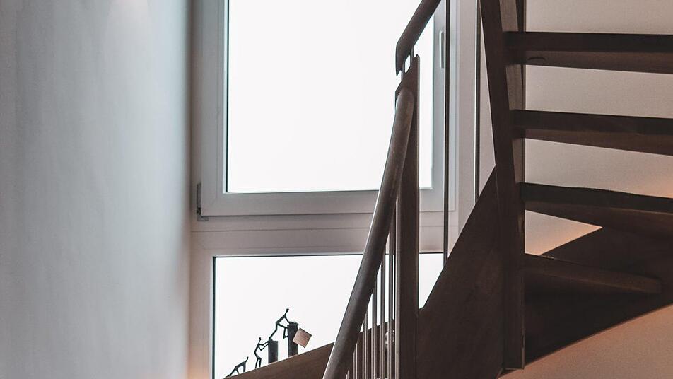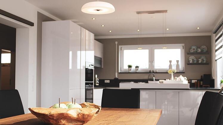 Aber auch das Innenleben des Hauses bietet eine Fülle von außergewöhnlichen Überraschungen. So besticht die offene Küche mit zusätzlichen Essplatz durch ihre Schlichtheit und Funktionalität. Ein echter architektonischer "Hingucker" ist die Wangentreppe mit LED-Beleuchtung und Edelstahlsprossen. Dabei laden die verschiedenen Erdtöne auf den Wänden und die Fliesen in Holzoptik als Kontrast zum weißen Innenputz sofort zum Verweilen ein. Dabei muss man schon genauer hinschauen, um den Vinyl-Designbelag im Obergeschoss vom kompletten Fliesenbelag im Erdgeschoss zu unterscheiden.