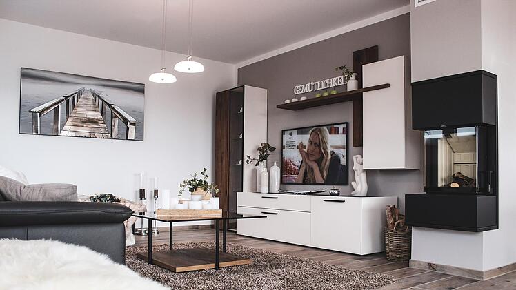 Dass man dabei auf eine ansprechende äußere Gestaltung des Hauses nicht verzichten muss, zeigt das neue Musterhaus der Rödentaler Firma Schopf & Teig. Die normale Rechteckform des Grundrisses wurde dabei kreativ ergänzt. So sind die durch die Garagen-Carport-Kombination integrierte Eingangsüberdachung und die große Schiebetür im Erdgeschoss zusätzliche architektonische Stilelemente. Zusätzlich wurde noch sehr viel Wert auf die Farbgestaltung gelegt, denn die grauen Fenster und die anthraziten Tonziegel bilden einen modernen Kontrast zum weißen Außenputz.