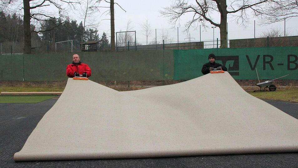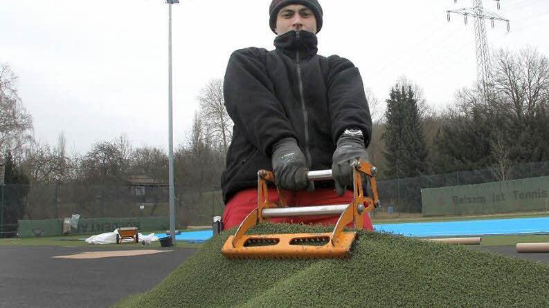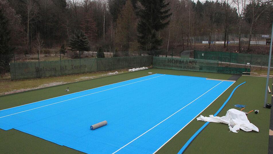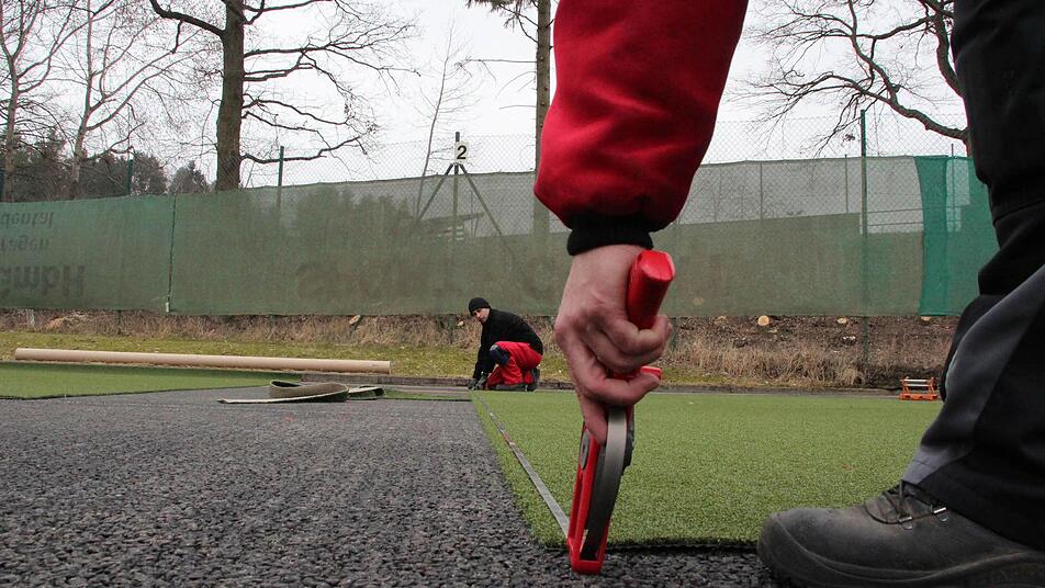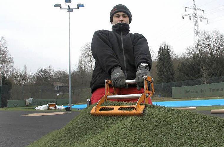 Bevor Bock und die anderen Vereinsmitglieder hier die ersten Bälle schlagen können, müssen die Männer der Firma Polytan, aus dem oberbayerischen Burgheim, fast zwei Wochen schneiden, kleben und rollen. Die Arbeiten mussten zwar aufgrund des langen Winters um ein paar Wochen nach hinten verschoben werden, aber sind in der vergangenen Woche gestartet.