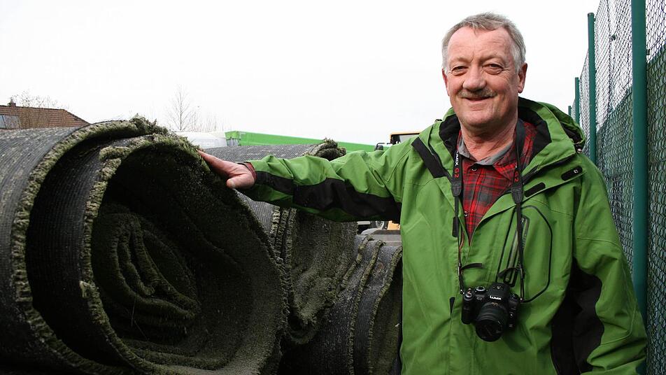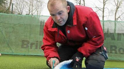 "Zuerst gleichen wir die Unebenheiten aus und danach kommt der Kunstrasen drauf", sagt Michael Oldenburger von der Firma Polytan. Er legt sein Maßband an, schaut ob alles passt und legt einen langen Metallbalken an die abgemessene Stelle. "Wir haben uns für die Firma Polytan entschieden, weil die Marktführer für Sportstätten mit Kunstrasen sind", sagt Bock.