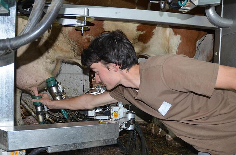 Für André Steiner traf es sich gut, dass er auf dem Hof von Holger Heilingloh an einem Melkroboter geprüft werden konnte. Auf dem elterlichen Betrieb des 19-Jährigen übernimmt ebenfalls ein Roboter das Melken, der 65 Milchkühe. Bei der Prüfung muss der Roboter allerdings auf Handbetrieb geschaltet und praktisch wie eine gewöhnliche Melkmaschine benutzt werden. Sonst wäre es ja zu leicht. Doch Vormelken, das Euter der Tiere auf mögliche Krankheiten untersuchen und dergleichen ist für André Steiner ja nichts Neues.