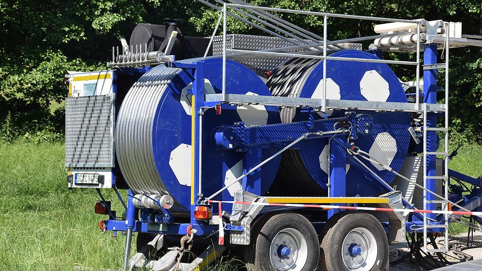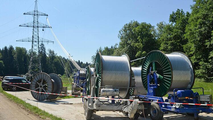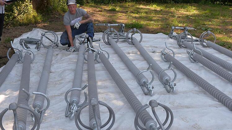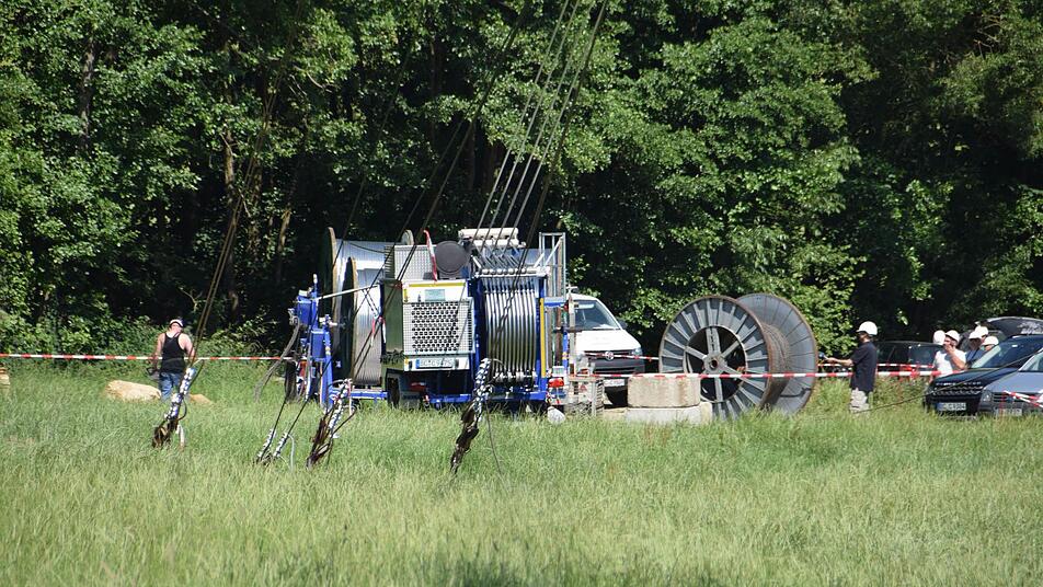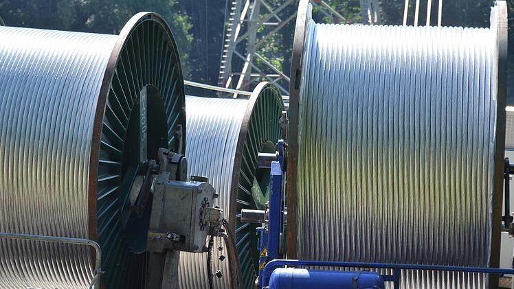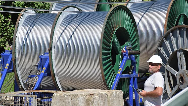 Die Trommeln im Talgrund zwischen Großgarnstadt und Frohnlach ruhen auch nicht lange. Dann beginnt eine Winde wieder zu ziehen, die vier Masten weiter in Richtung Frohnlach steht. Von den Kabeltrommeln spulen sie dabei Meter für Meter der knapp dreieinhalb Zentimeter dicken Seile ab. 2300 Meter sind auf jeder Spule aufgerollt. "Der Meter kostet rund fünf Euro", sagt Eugen Bößendorfer. Er muss es wissen, denn er ist der Service-Gruppenmeister. Als solcher ist er für den Aufbau, die Kontrolle und spätere Wartung der Leitung zuständig, an der zurzeit drei Firmen mit insgesamt rund 100 Beschäftigten arbeiten.