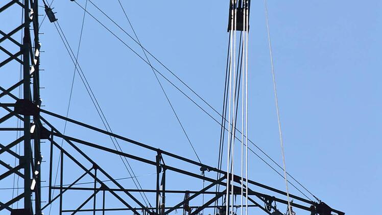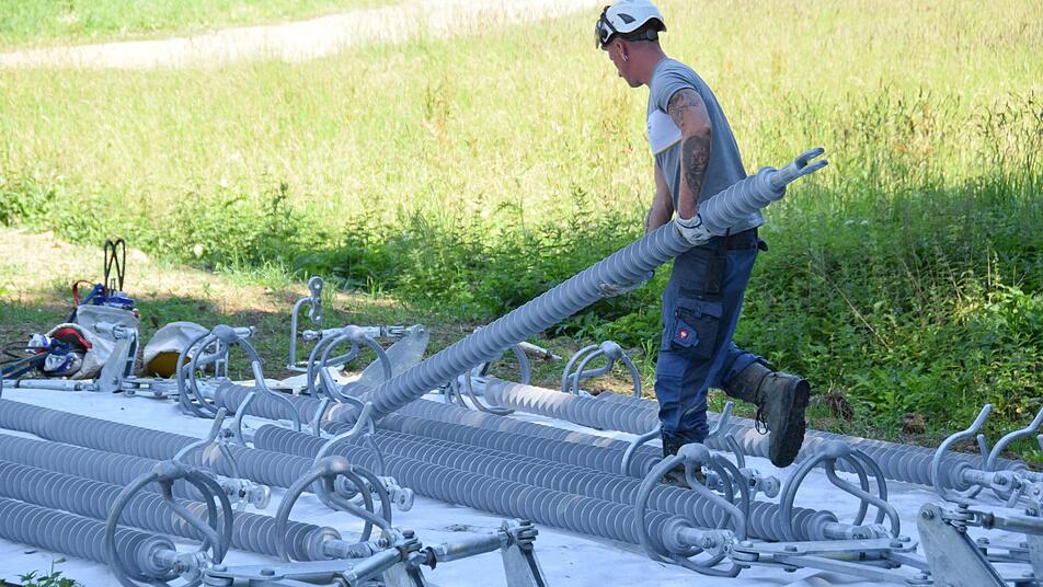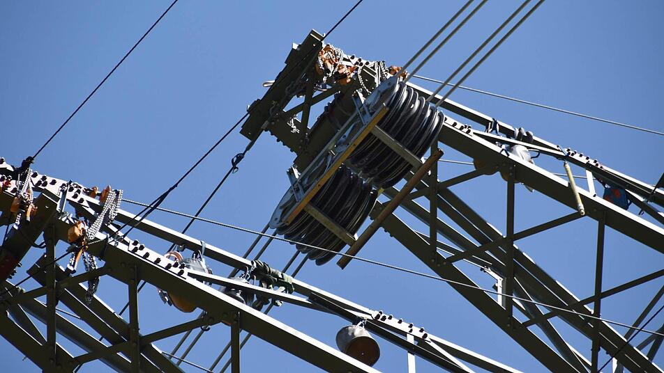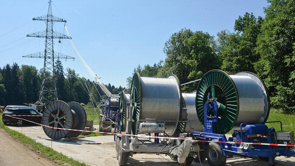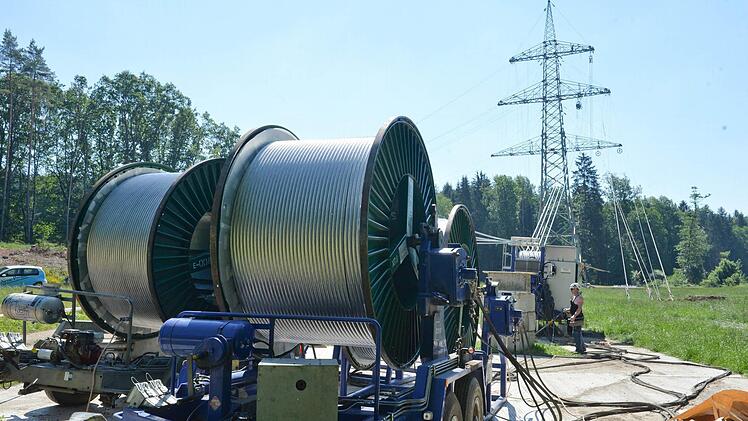 Bei Frohnlach werden zurzeit die ersten Leiterseile auf die Masten der neuen Starkstromtrasse aufgezogen.
