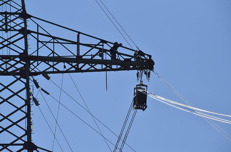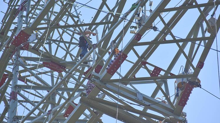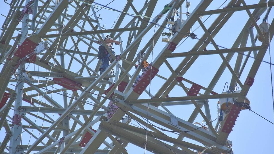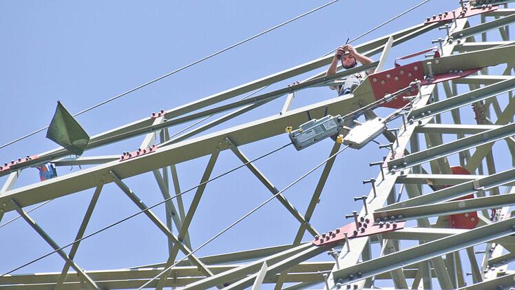Mit den Vorzugseilen, den Leiterseilen, der Abspannung für den Mast und weiteren Seilen für eine Winde, mit der je Mast 24 große Isolatoren hoch gezogen werden, wirkt das Ganze wie die Takelage eines Segelschiffes. Bei der momentanen Hitze, wie bei einem Schiff in der Südsee. Doch die Männer müssen auch bei Regen und Kälte rauf. "Nur bei Eis geht es nicht", sagt Bößendorfer. Aber damit ist derzeit kaum zu rechnen. Eher mit Gewitter. Da geht auch nichts.